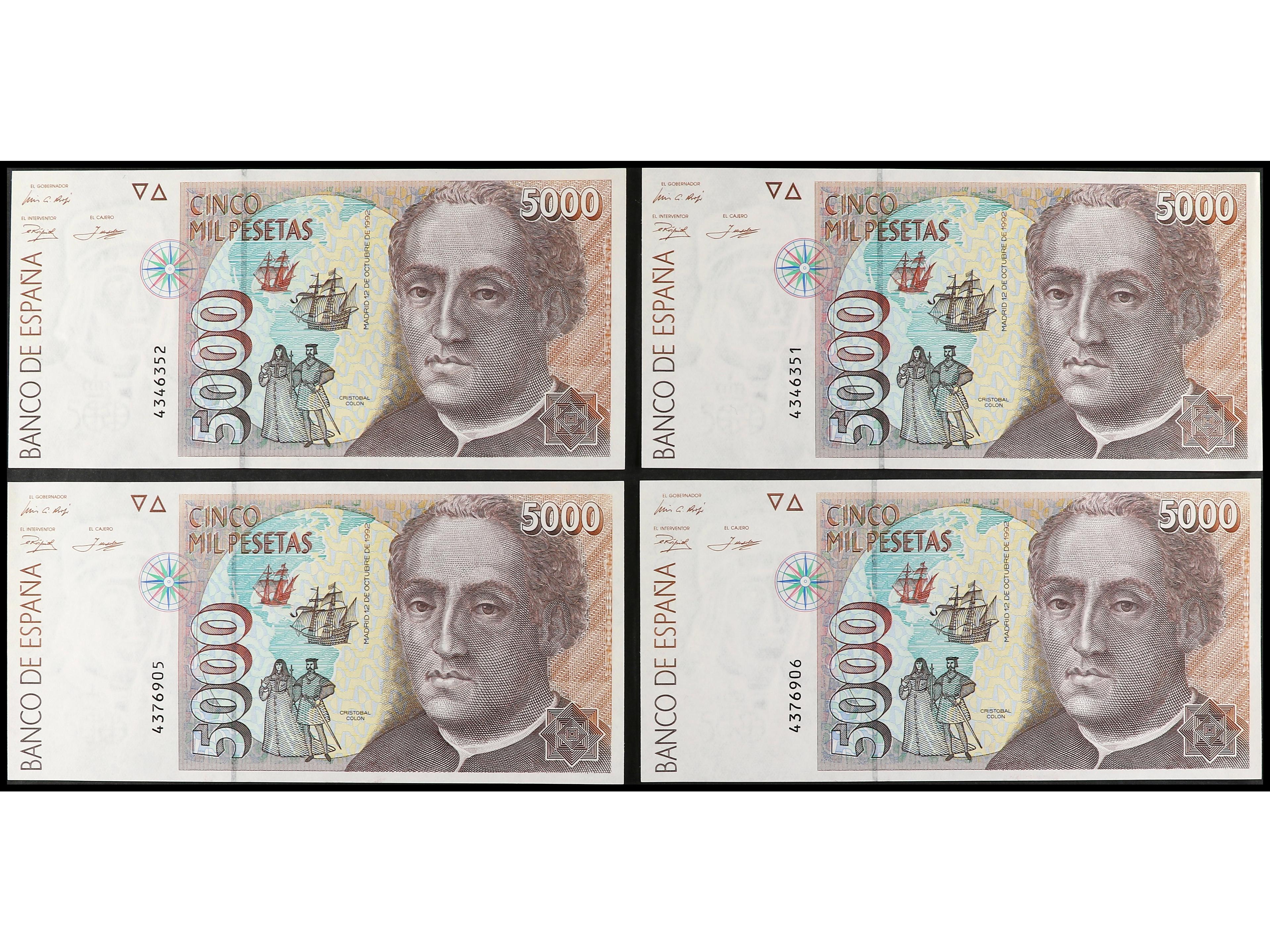 3249 imageLote 4 billetes 5.000 Pesetas. 12 Octubre 1992. Colón. Sin serie. Dos parejas correlativas. Ed-484. SC- a SC. (Image1)