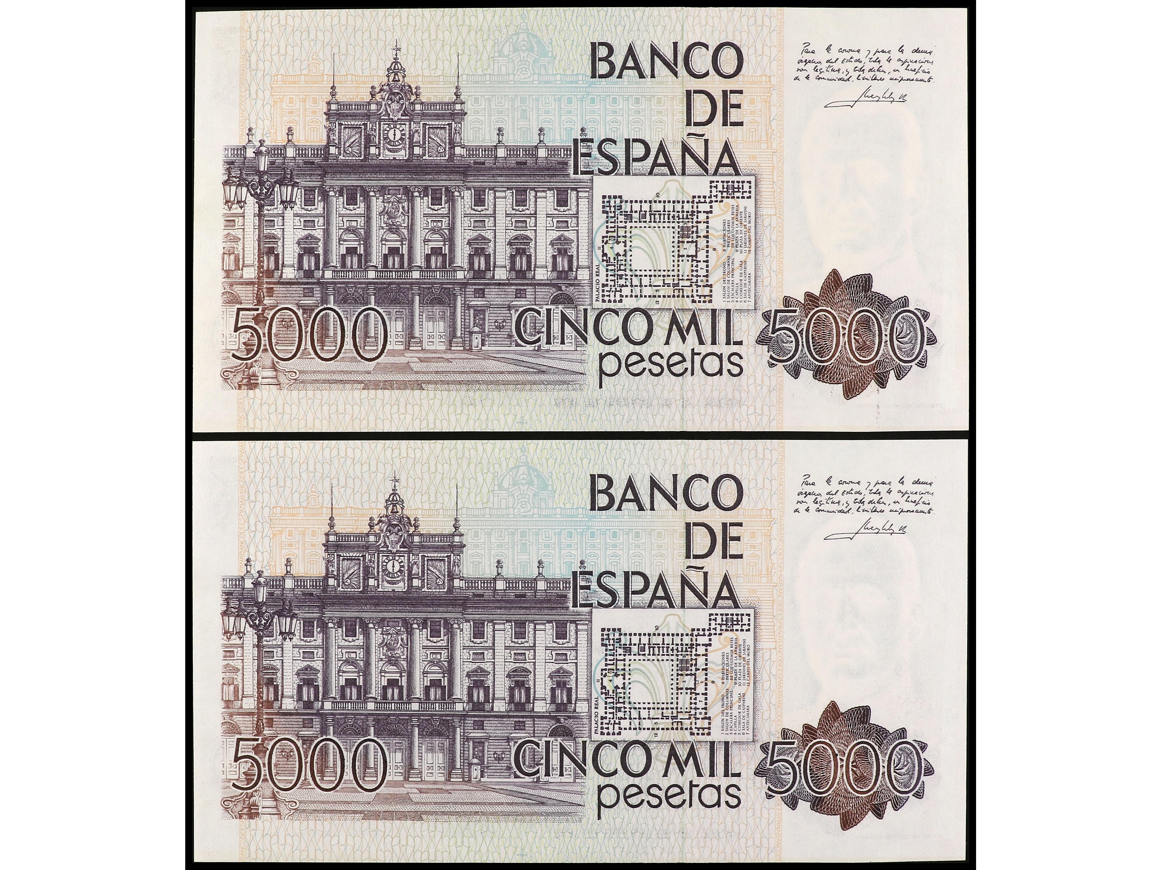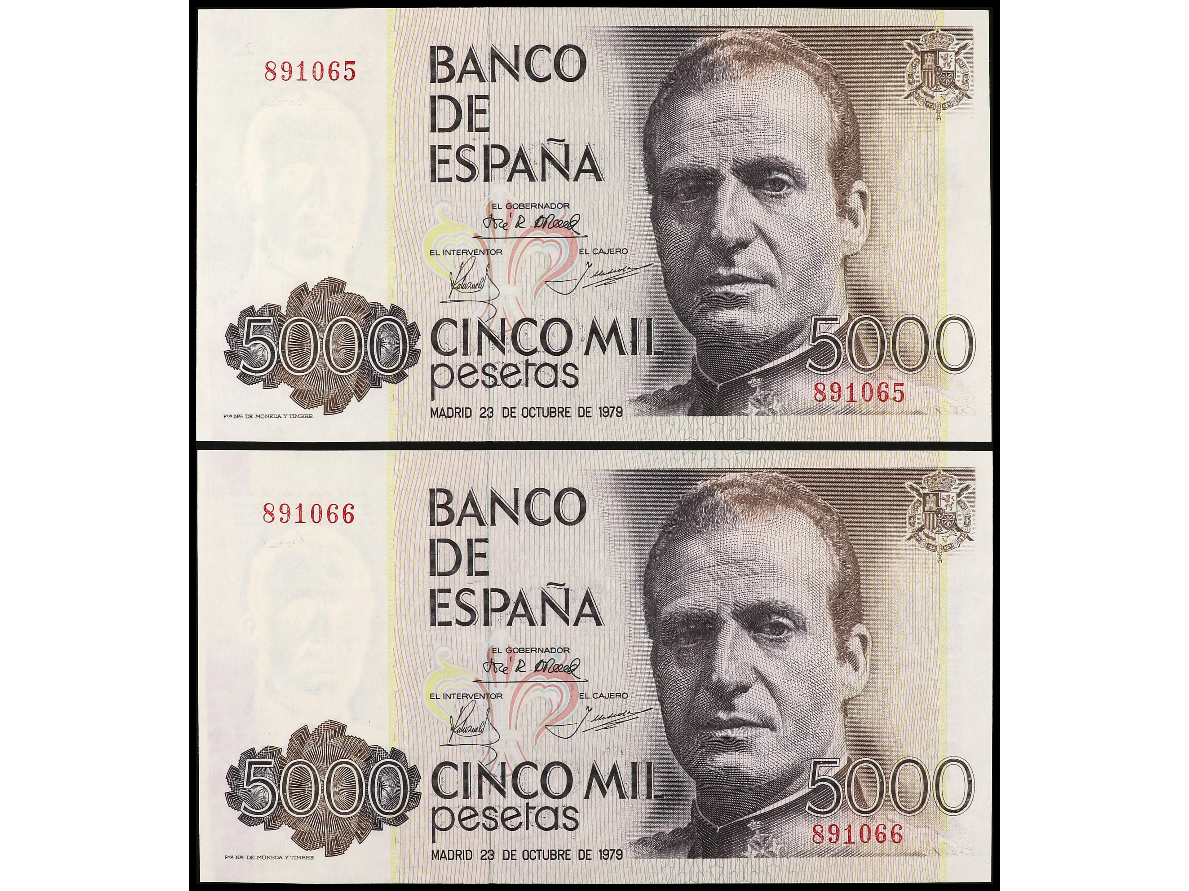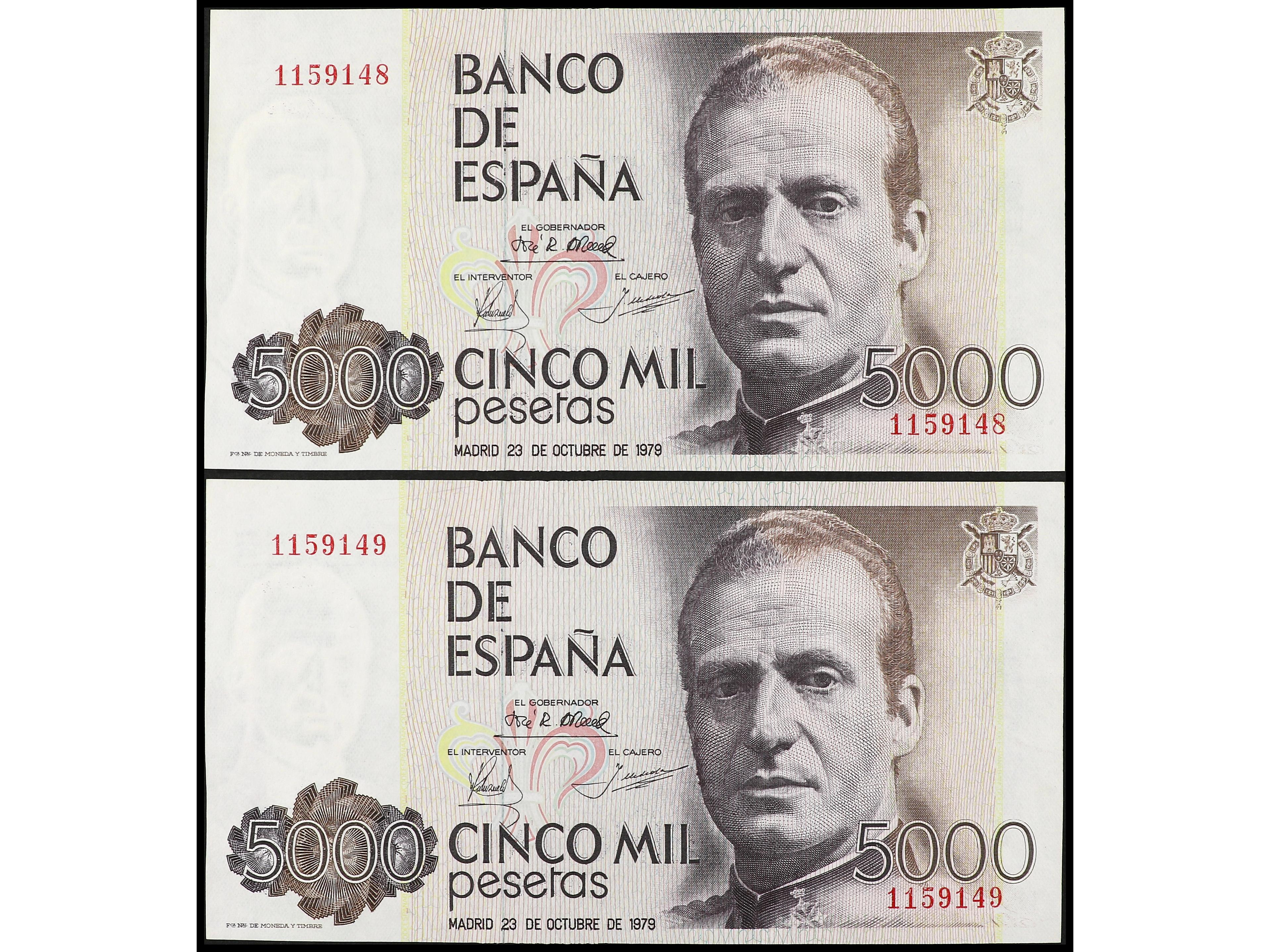 3243 imageLote 2 billetes 5.000 Pesetas. 23 Octubre 1979. Juan Carlos I. Sin serie. Pareja correlativa. Ed-478. SC. (Image1) (Image2)