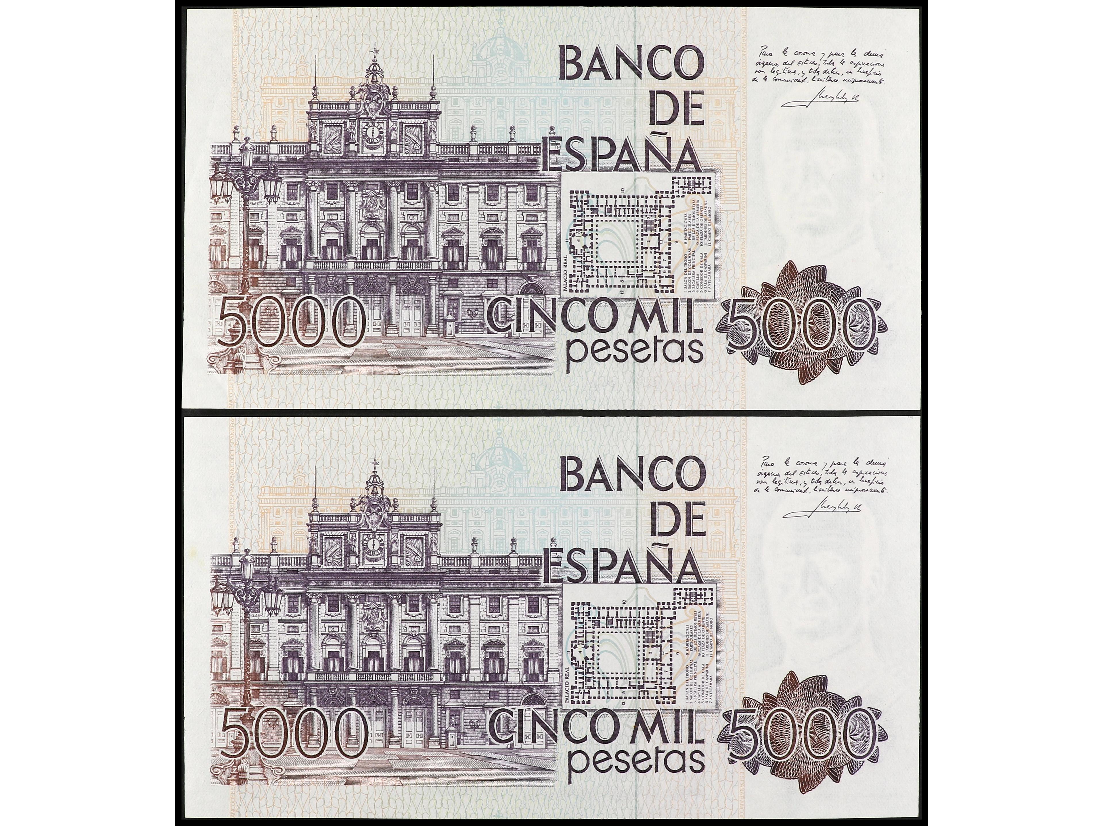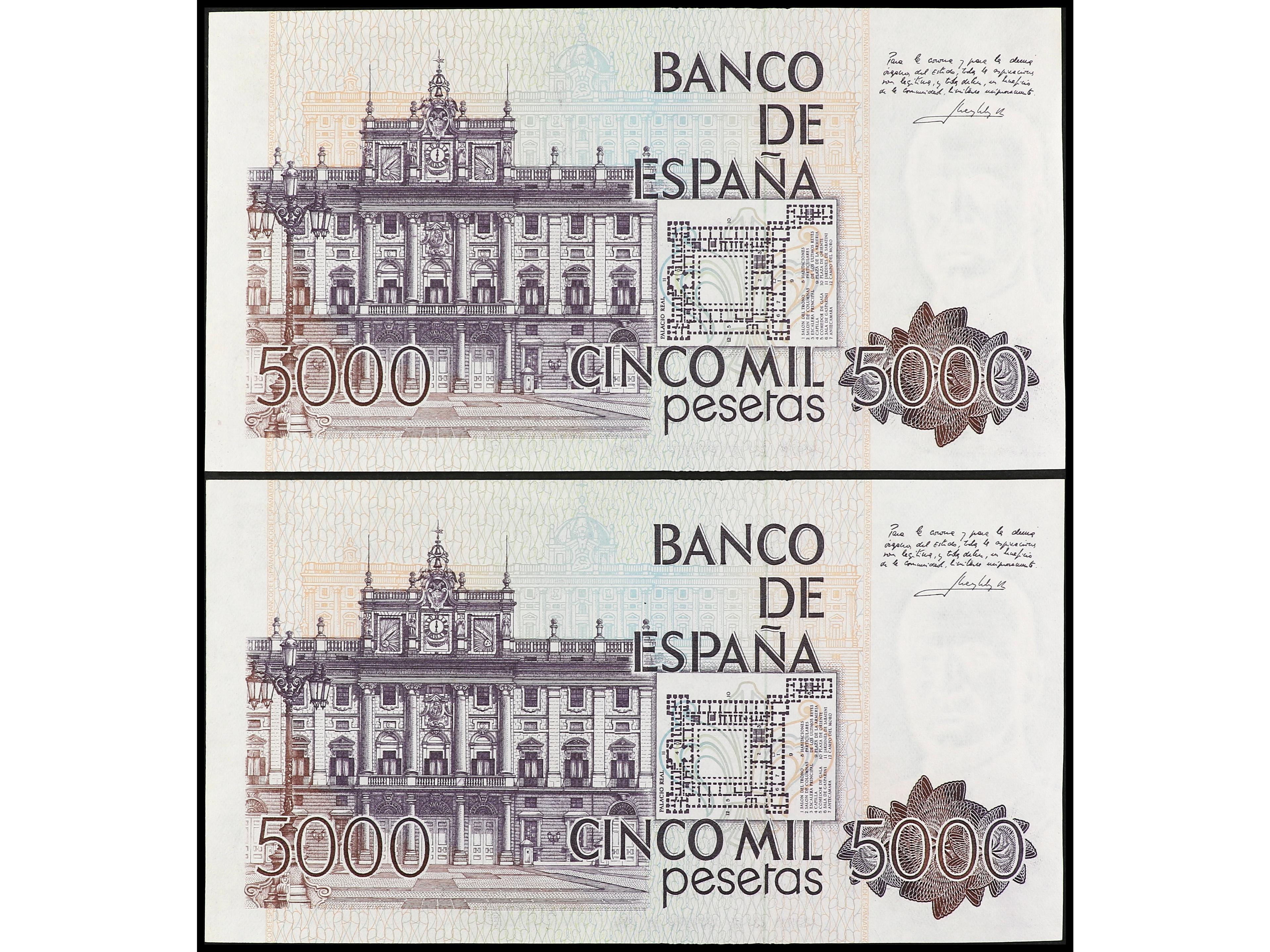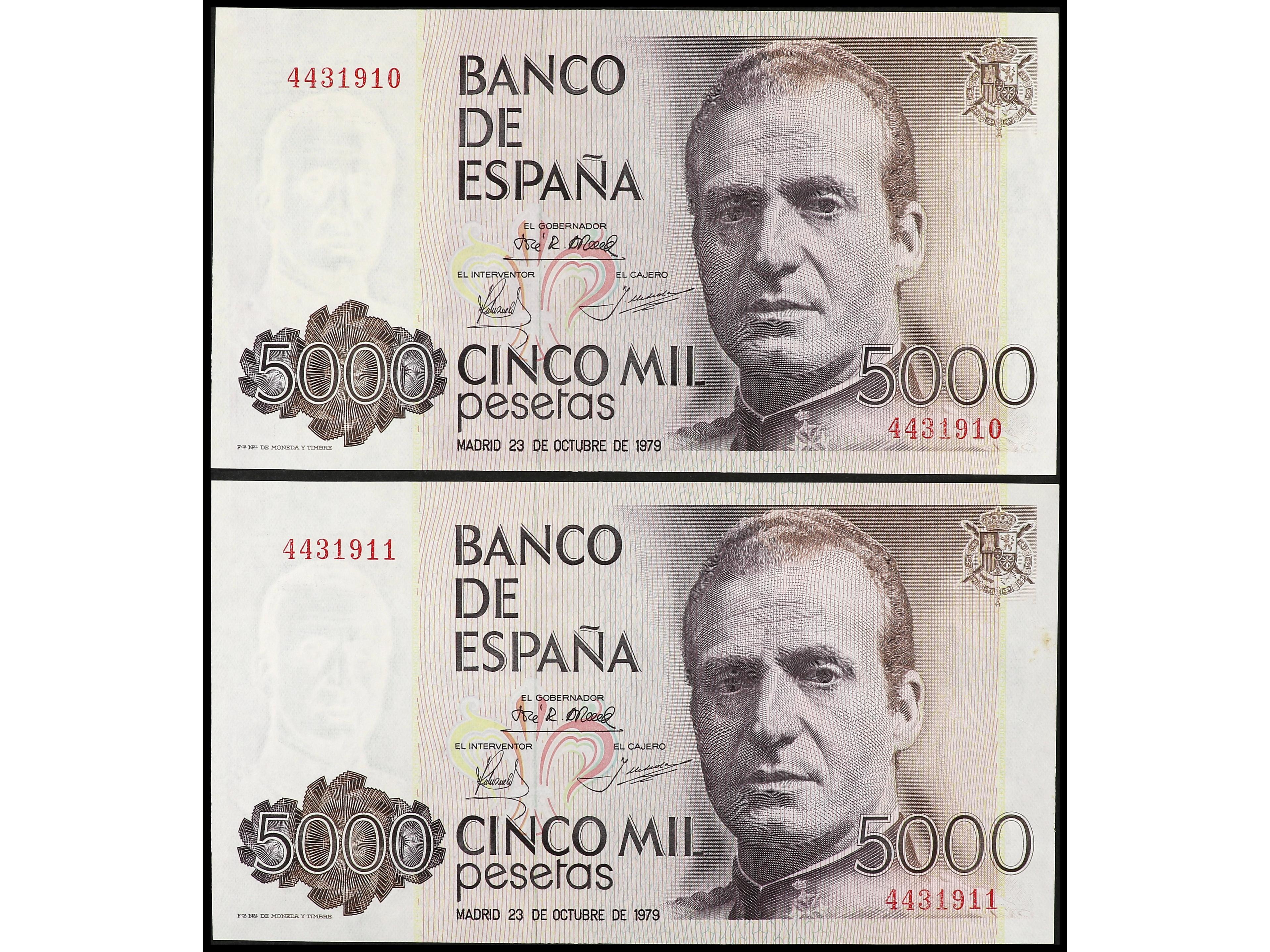 3243 imageLote 2 billetes 5.000 Pesetas. 23 Octubre 1979. Juan Carlos I. Sin serie. Pareja correlativa. Ed-478. SC. (Image1) (Image2)