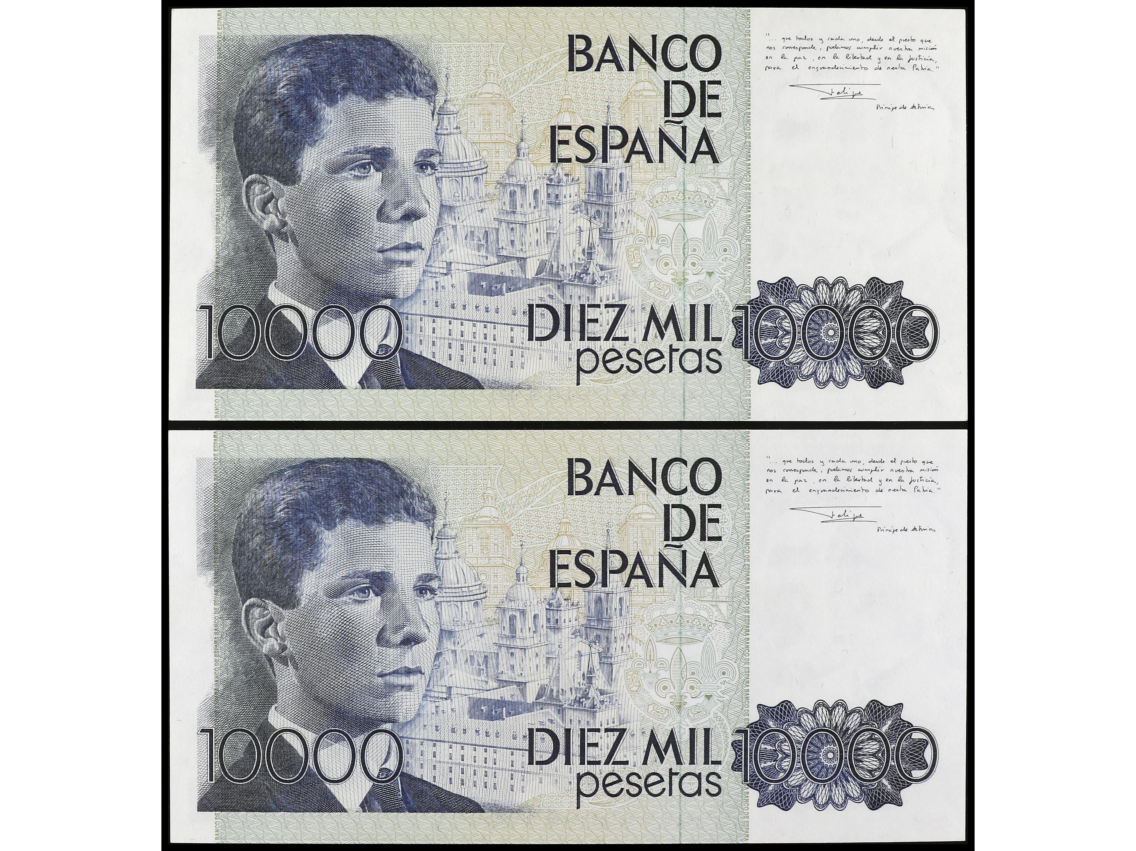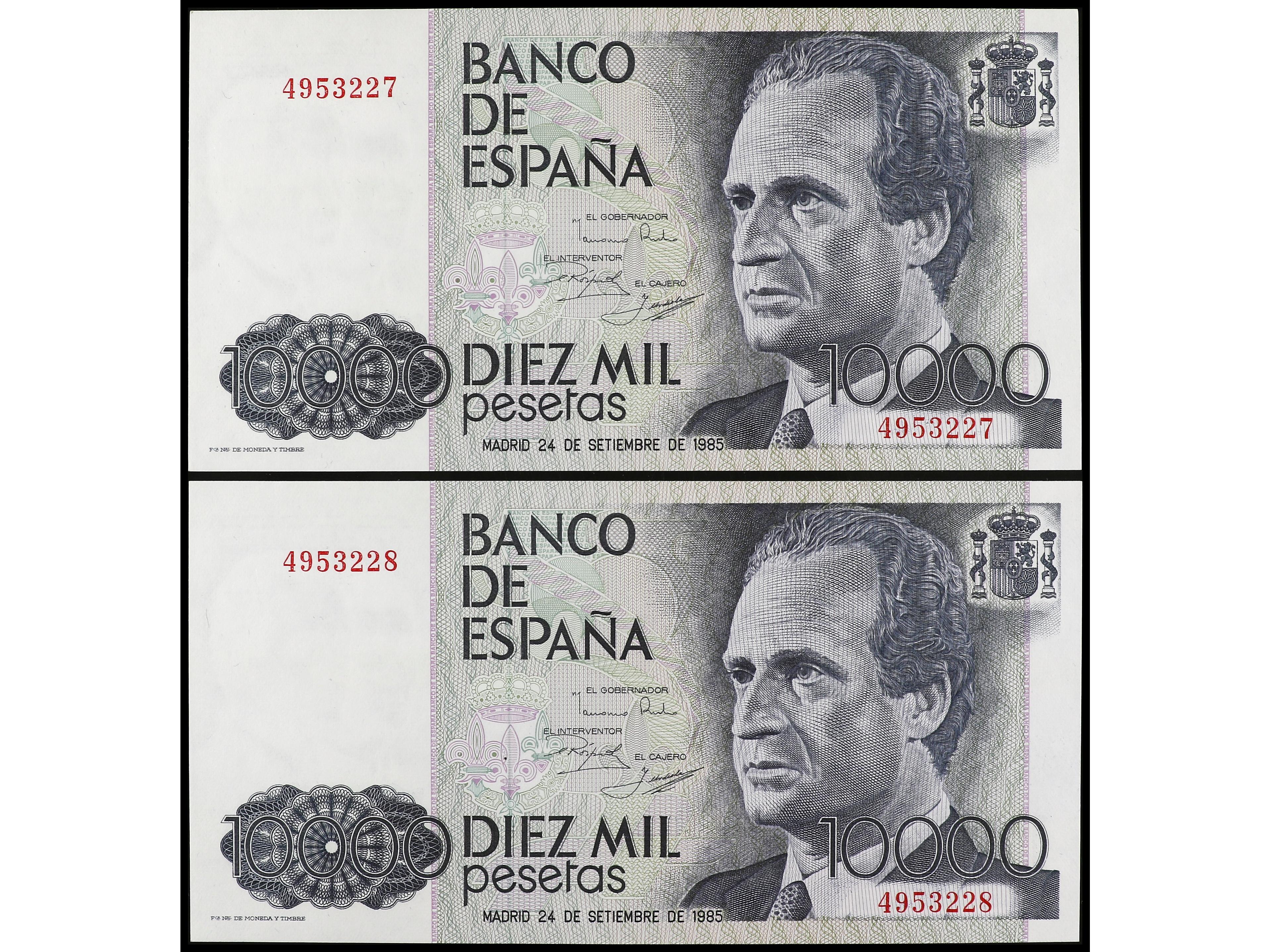 3252 imageLote 2 billetes 10.000 Pesetas. 24 Setiembre 1985. Juan Carlos I. Sin Serie. Pareja correlativa. Ed-481. SC-. (Image1) (Image2)
