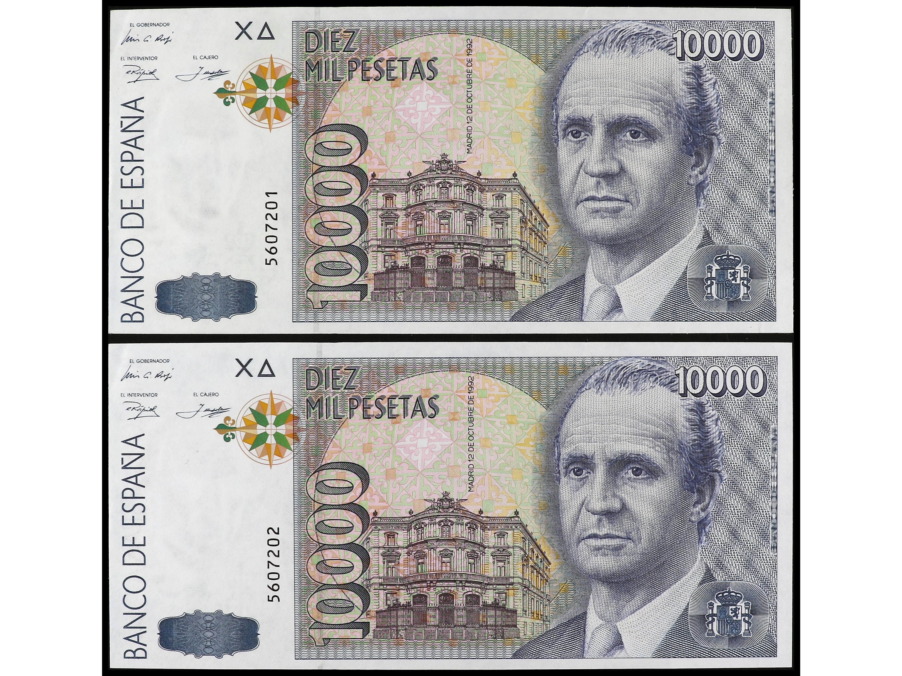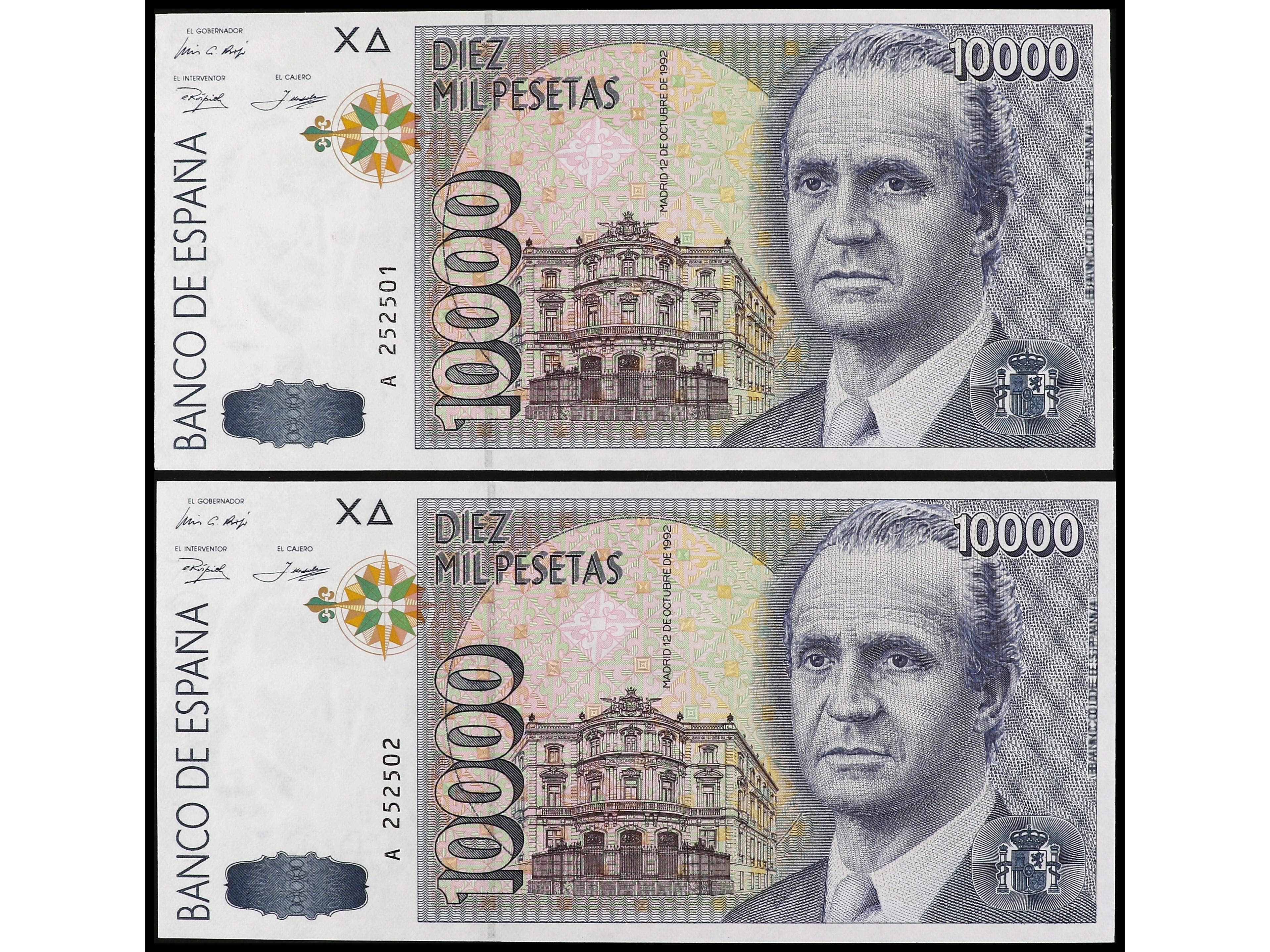 3250 imageLote 2 billetes 10.000 Pesetas. 12 Octubre 1992. Juan Carlos I. Serie A. Pareja correlativa. Ed-485a. SC-. (Image1) (Image2)