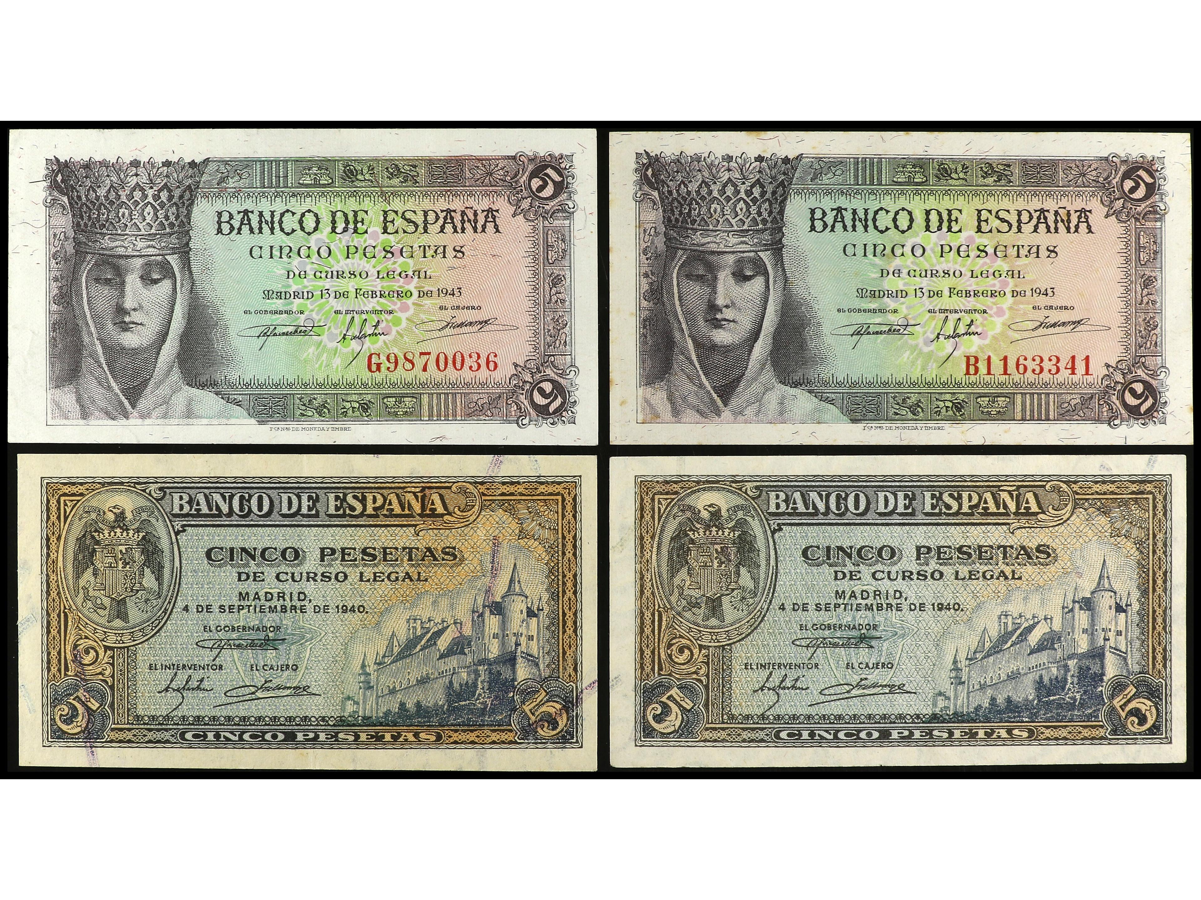3255 imageLote 4 billetes 5 Pesetas. 1940 y 1943. Alcázar de Segovia Serie A y G e Isabel La Católica Serie B y G. A EXAMINAR. MBC+ a EBC. (Image1)