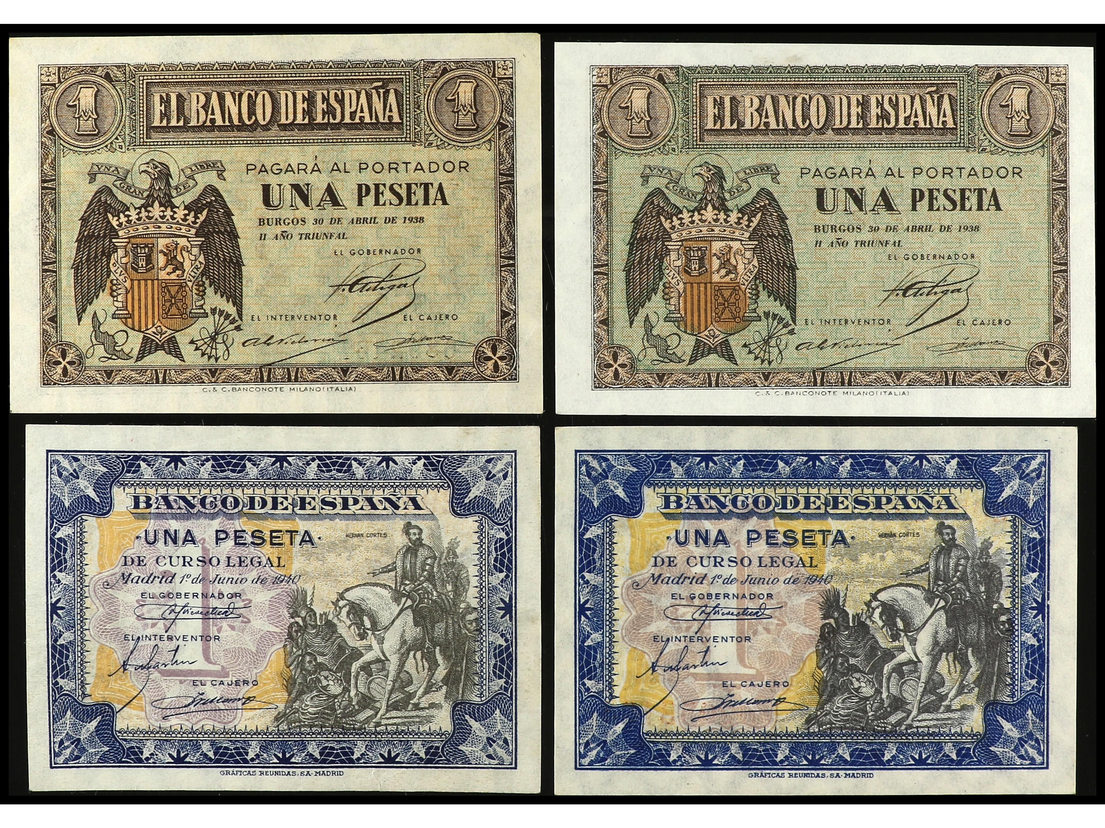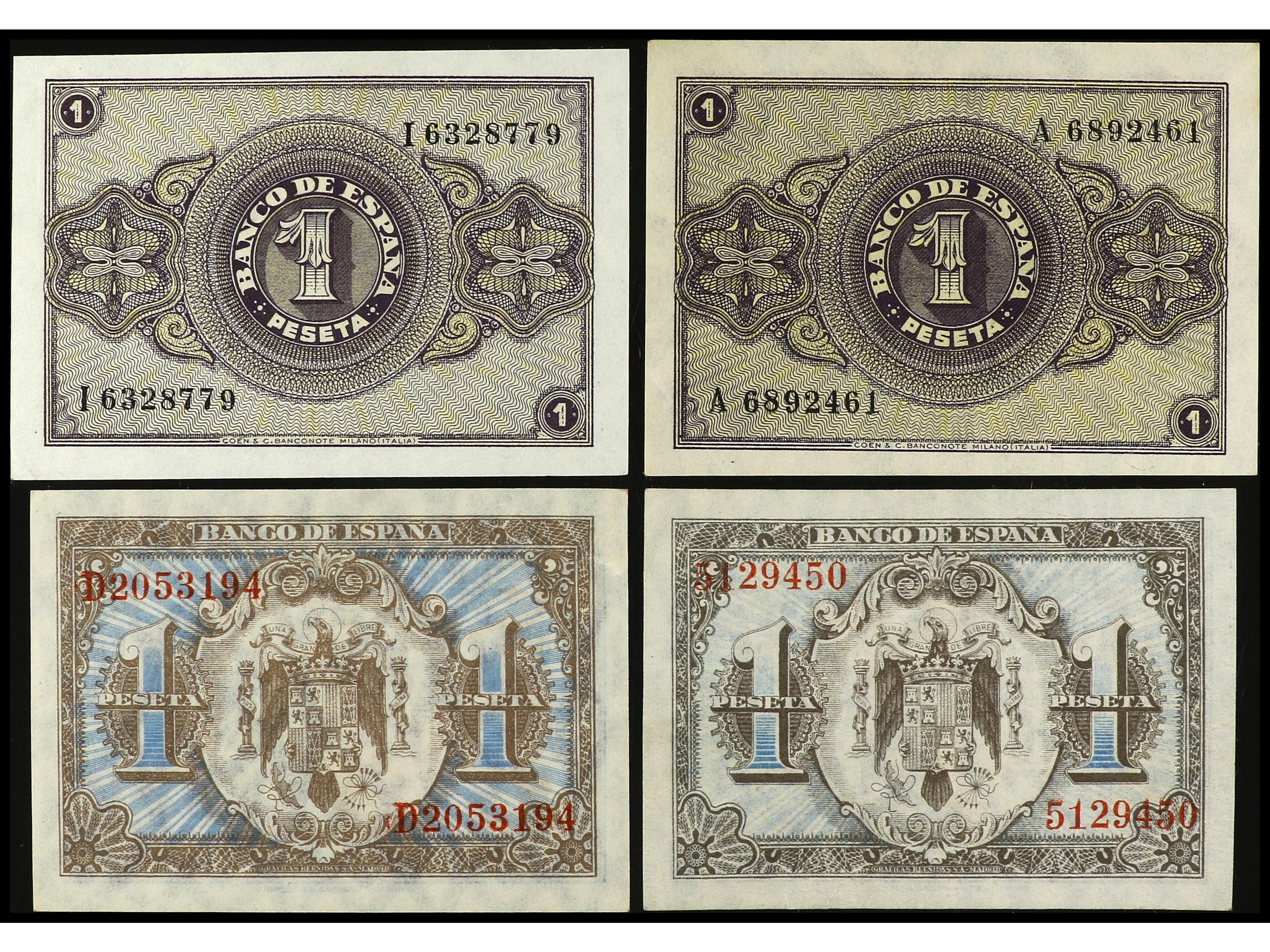 3254 imageLote 4 billetes 5 Pesetas. 1938 y 1940. 1 Peseta 30 Abril 1938 serie A e I y 1 Peseta 1940 Cortés Sin serie y serie D. A EXAMINAR. EBC- a SC-. (Image1) (Image2)
