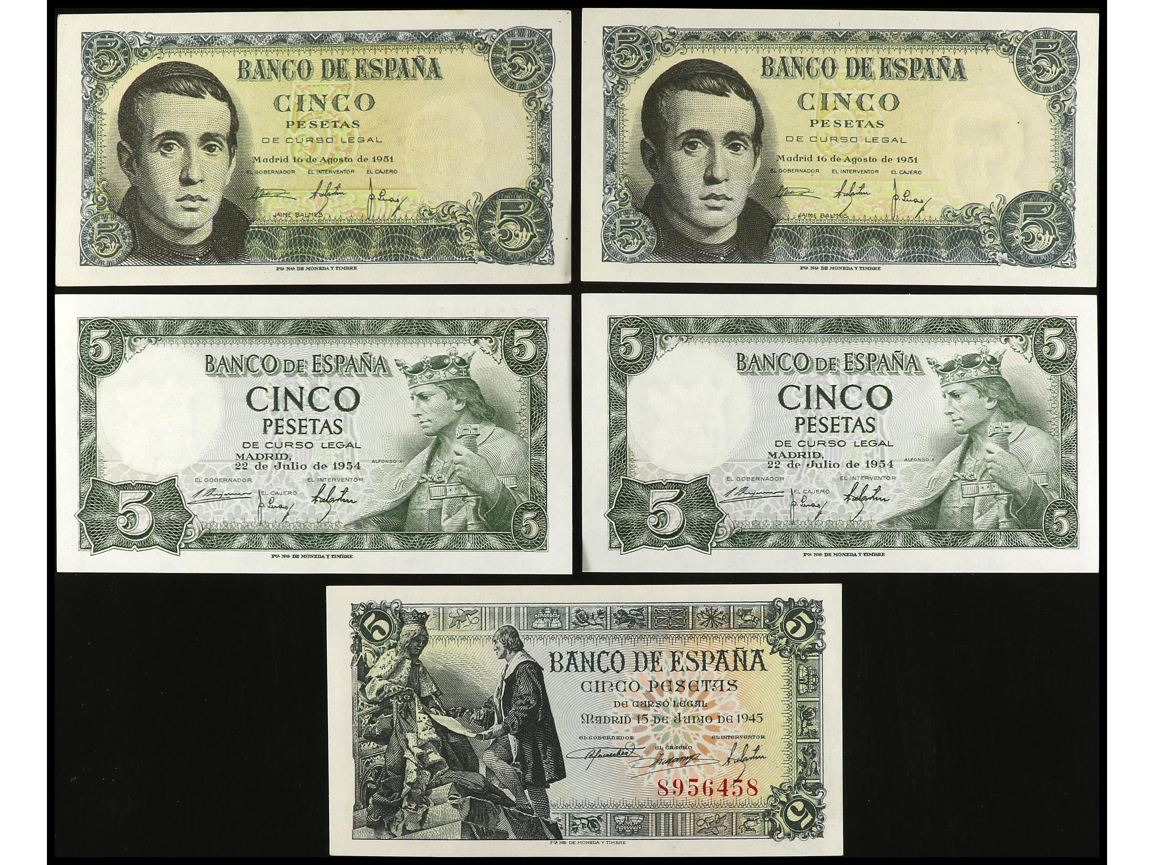 3257 imageLote 5 billetes 5 Pesetas. 2 billetes 5 Pesetas Balmes 1951 serie H e I. 5 Pesetas Capitulaciones de Santa Fe 1945 sin serie, 2 billetes 5 pesetas Alfonso X serie S pareja correlativa. A EXAMINAR. EBC- a EBC+. (Image1)