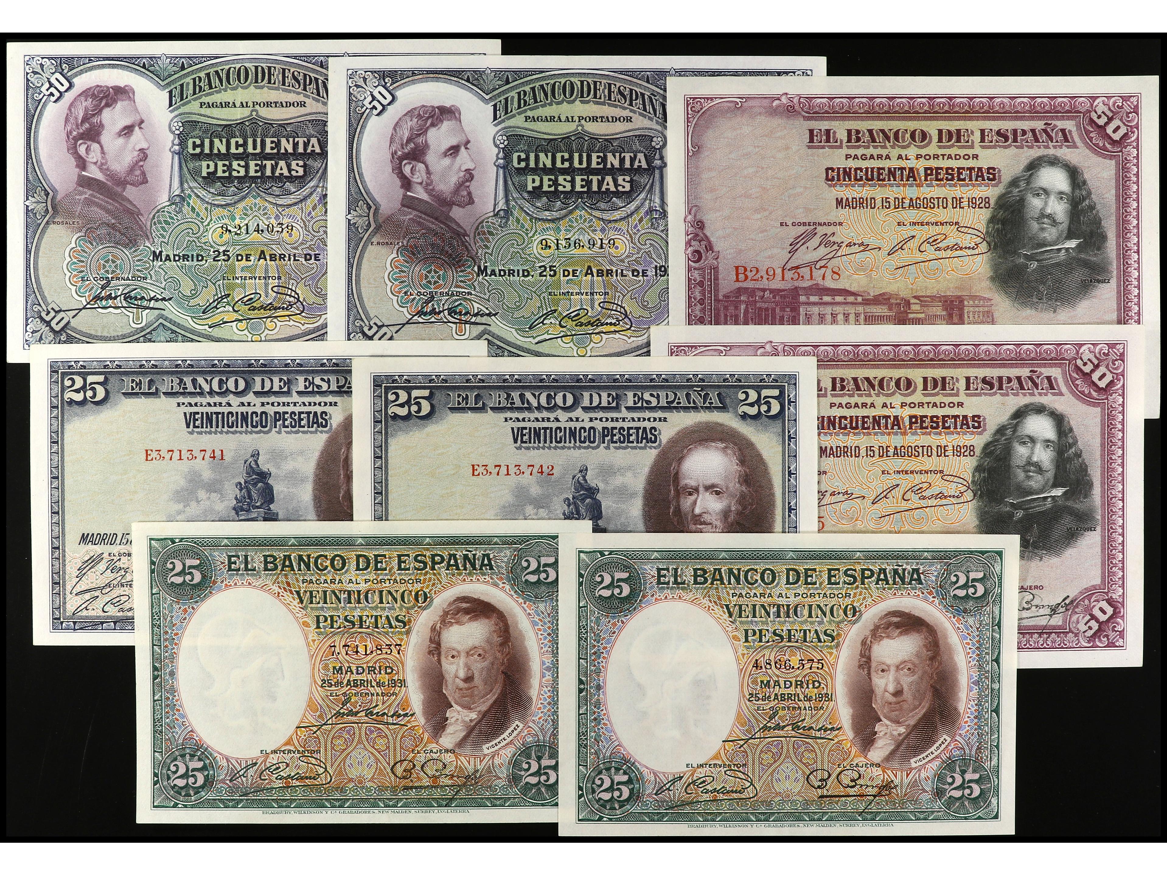 3259 imageLote 8 billetes 25 (4) y 50 Pesetas (4). 2 billetes 25 pesetas 1931 Vicente López, 2 billetes 25 pesetas Calderón de la barca serie E pareja correlativa, 2 billetes 50 Pesetas Rosales 1931 y 2 billetes 1928 Velázquez. EBC- a SC-. (Image1)