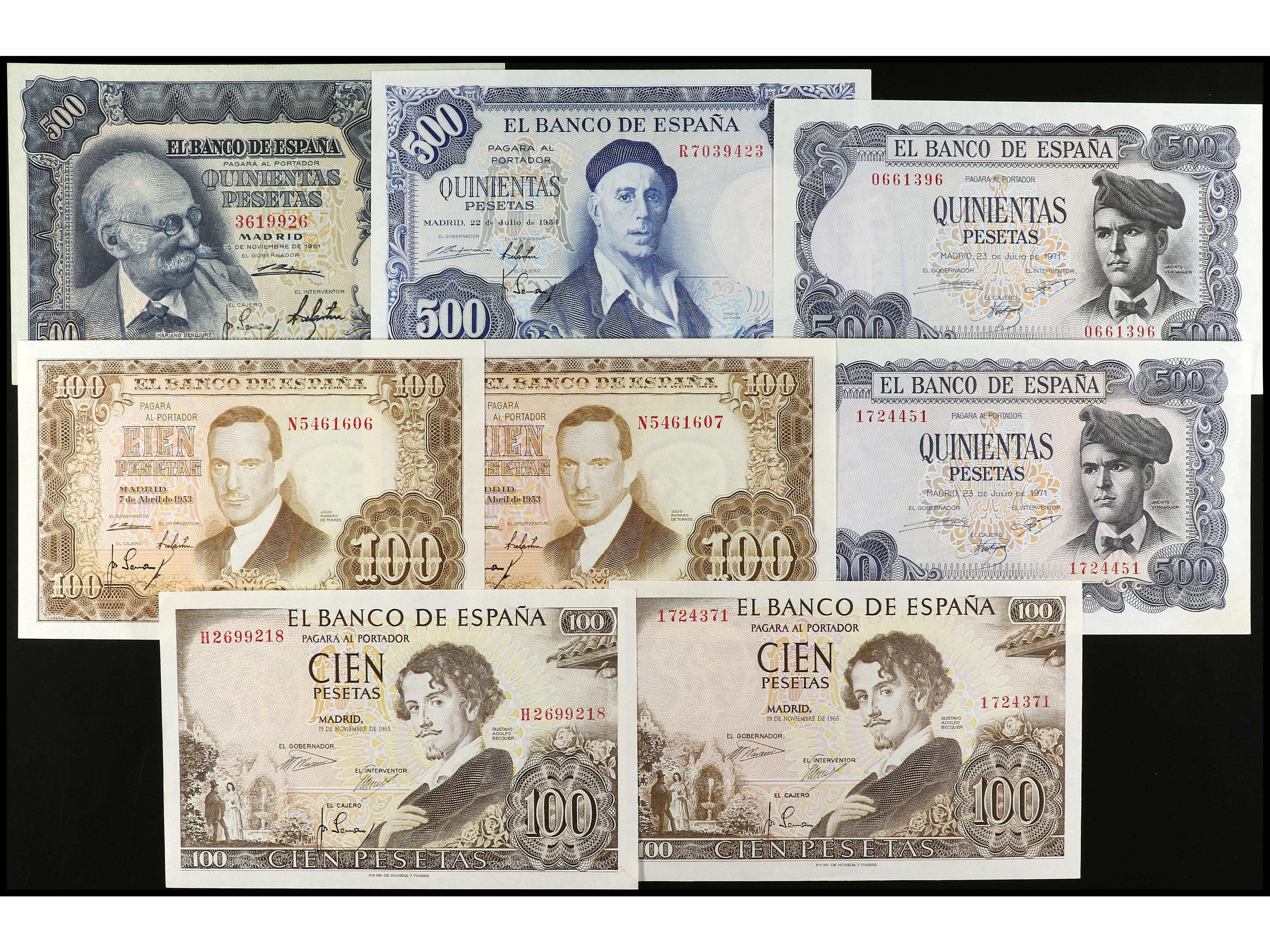 3260 imageLote 8 billetes 100 (4) y 500 (4) Pesetas. Romero de Torres serie N pareja correlativa. Bécquer sin serie y serie H, 500 pesetas Benlliure sin serie, 2 billetes 500 pesetas Verdaguer sin serie y 500 pesetas Zuloaga serie R. A EXAMINAR. MBC+ a EBC+. (Image1)