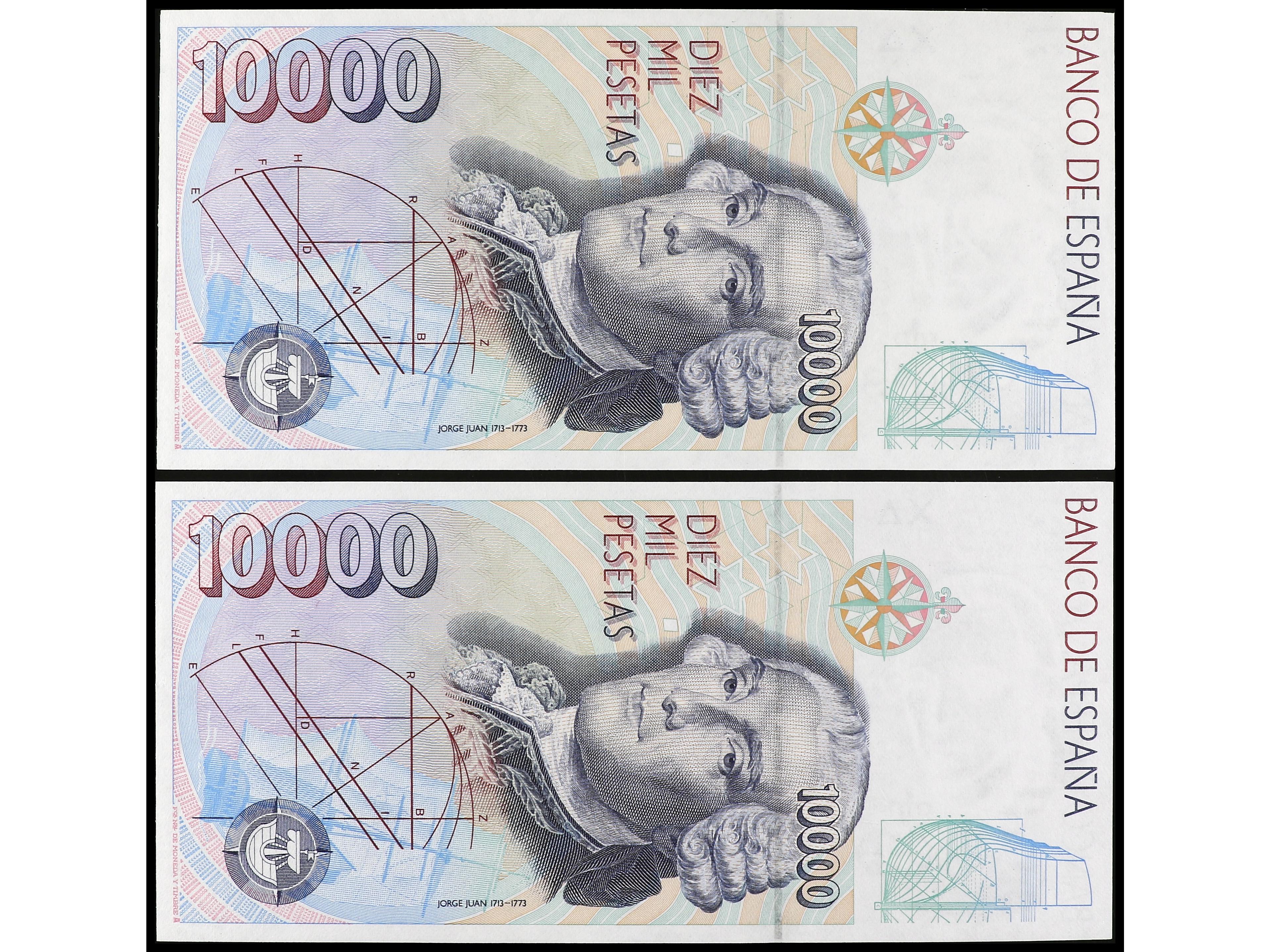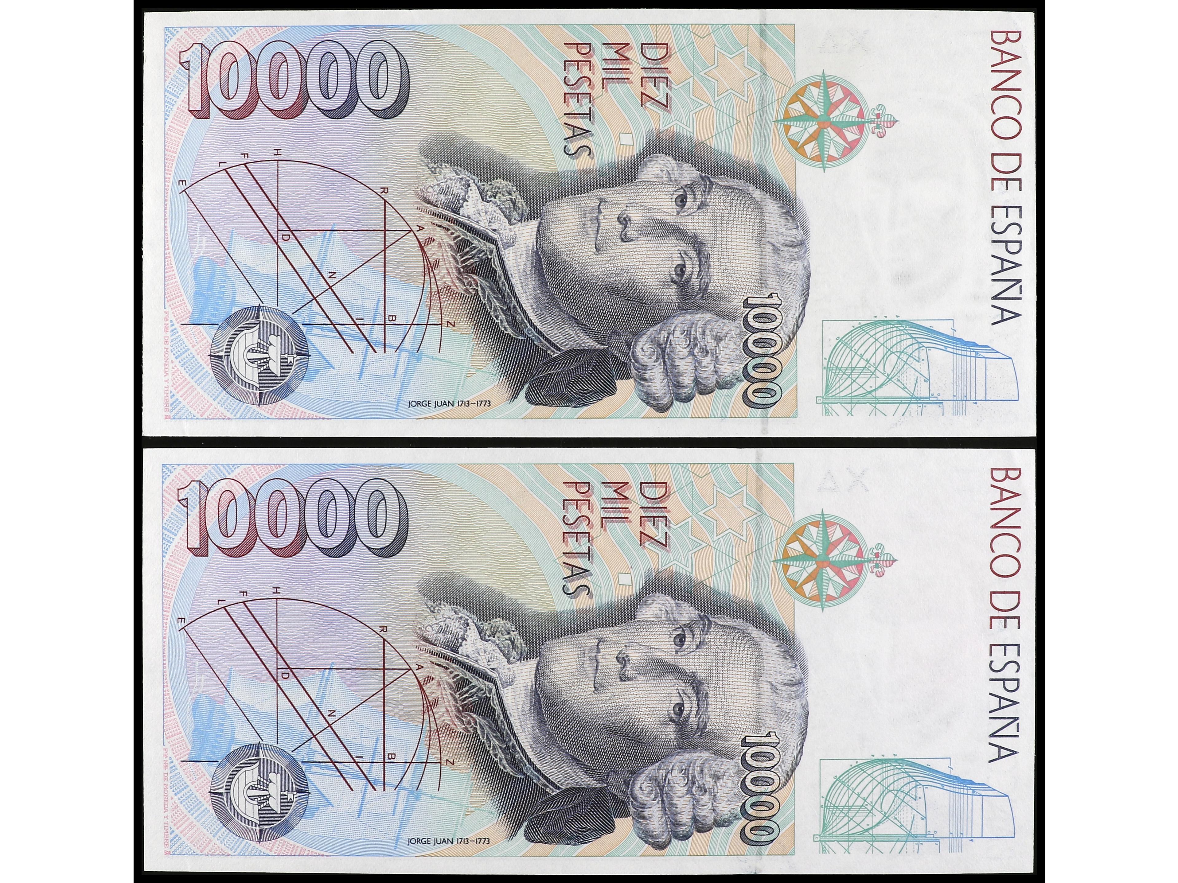 3251 imageLote 2 billetes 10.000 Pesetas. 12 Octubre 1992. Juan Carlos I. Sin Serie. Pareja correlativa. Ed-485. SC. (Image1) (Image2)