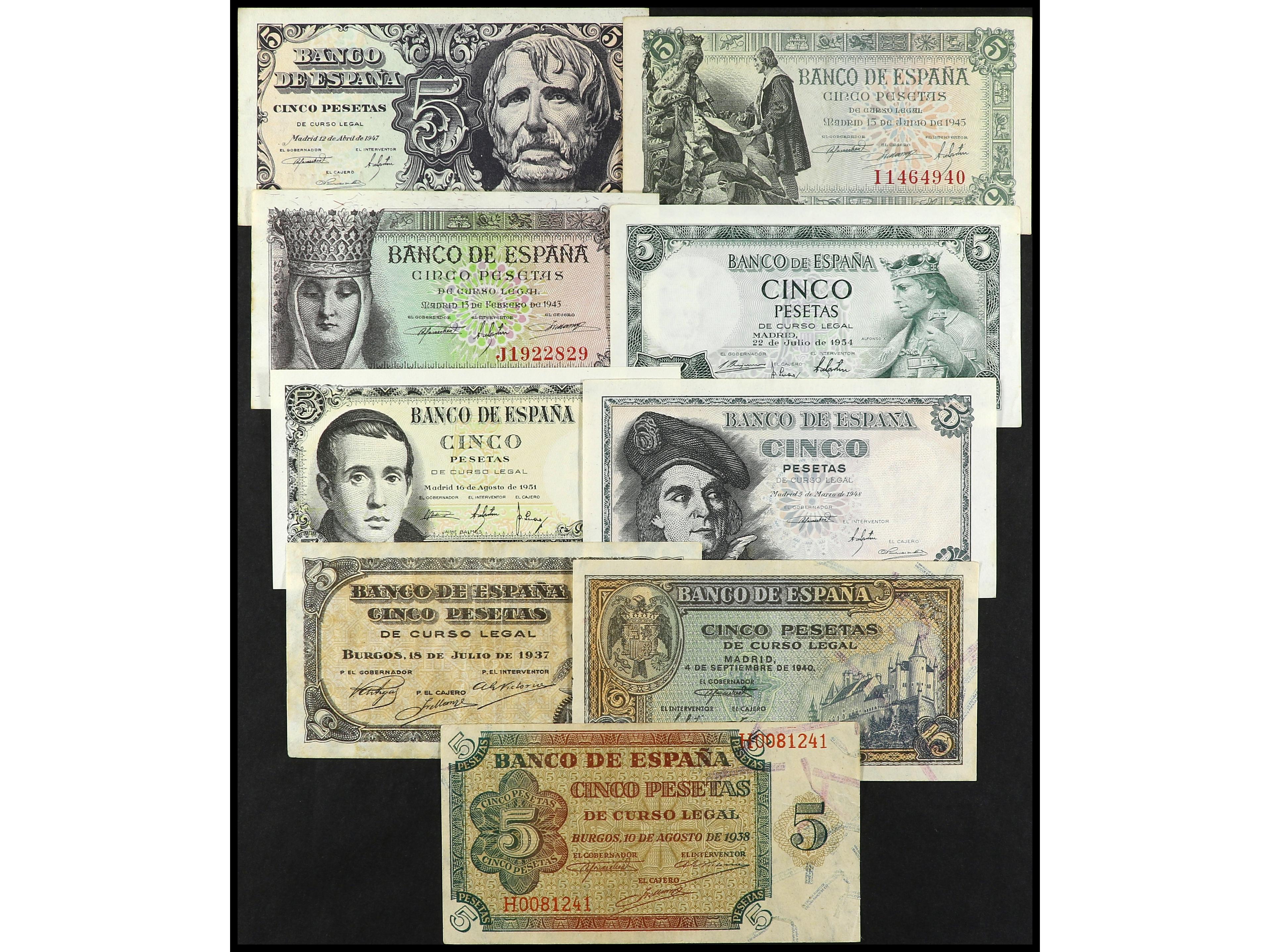 3261 imageLote 9 billetes 5 Pesetas. 1938 a 1954. Todos diferentes. A EXAMINAR. MBC- a EBC. (Image1)