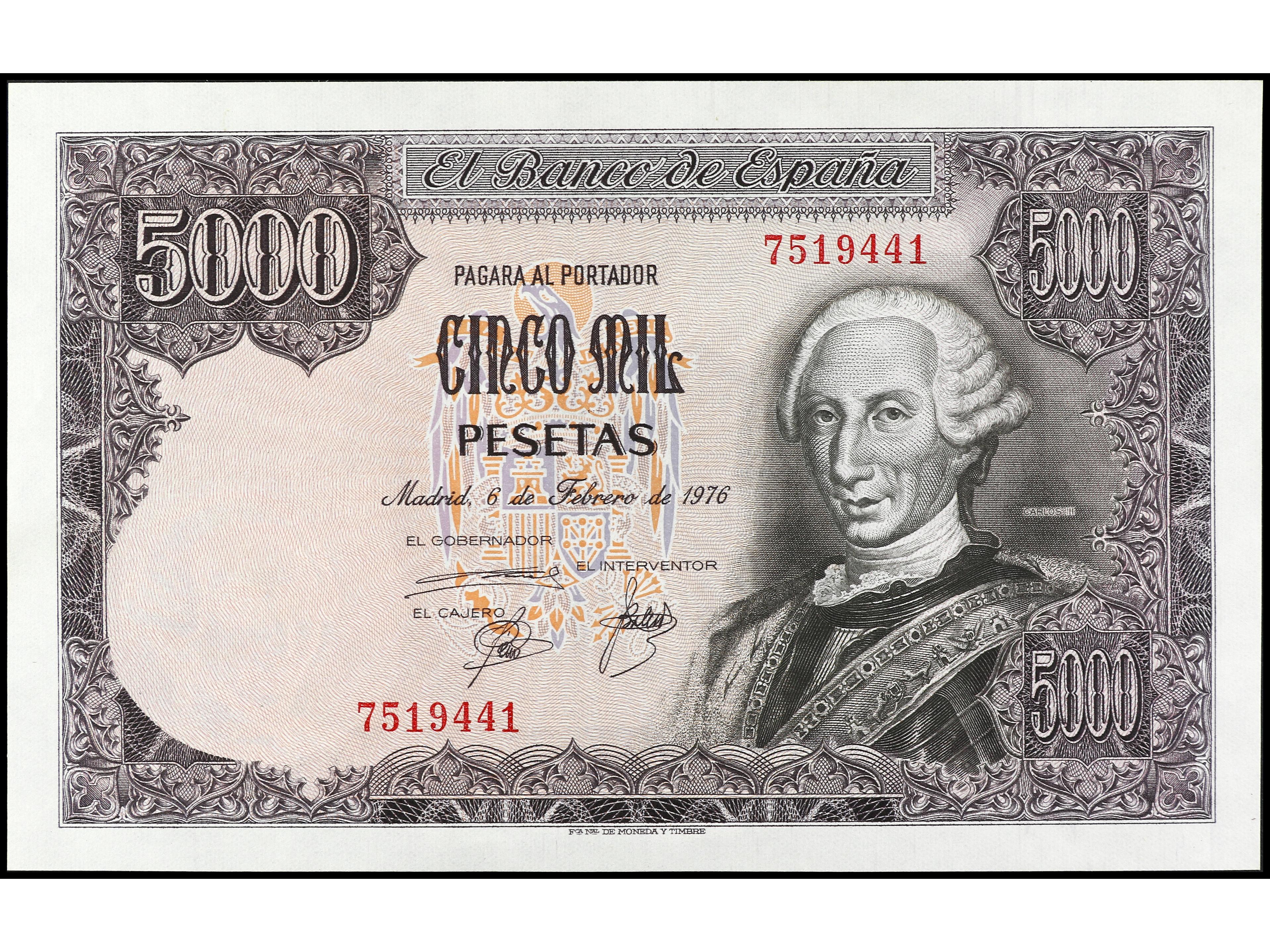 3242 image5.000 Pesetas. 6 Febrero 1976. Carlos III. Sin Serie. Ed-475. EBC+. (Image1) (Image2)