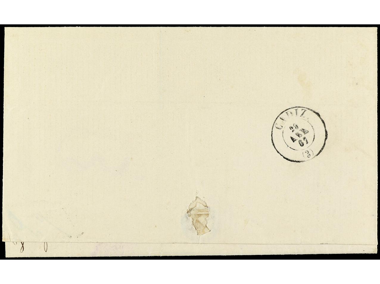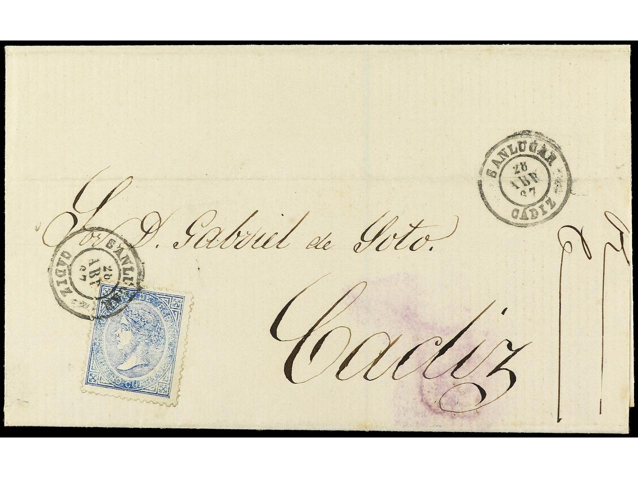 ESPAÑA. 1867. SAN LUCAR a CÁDIZ. 4 cuartos azul COLOR EVANESCENTE. RARO y más en carta. Ed.88. (Image1) (Image2)
