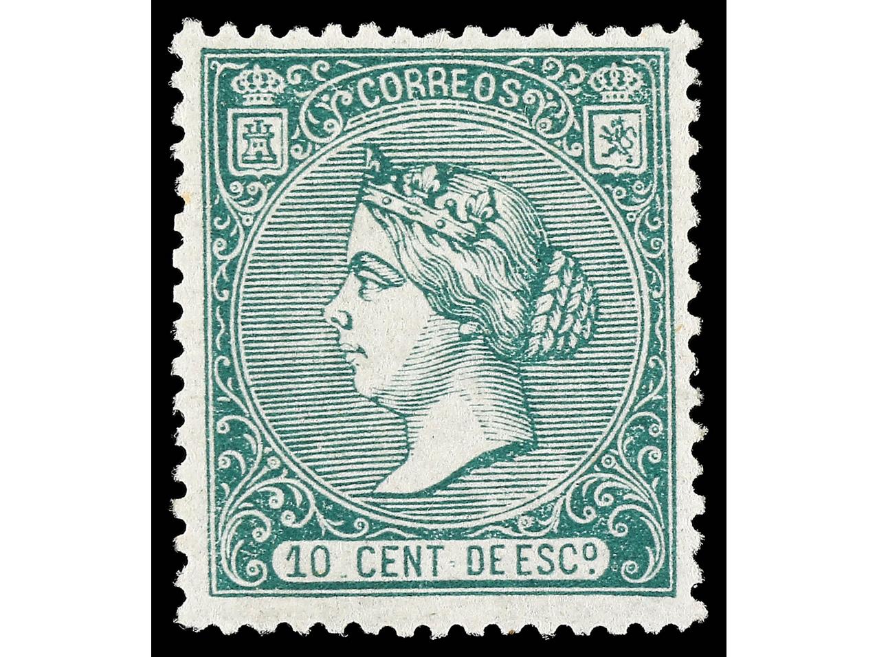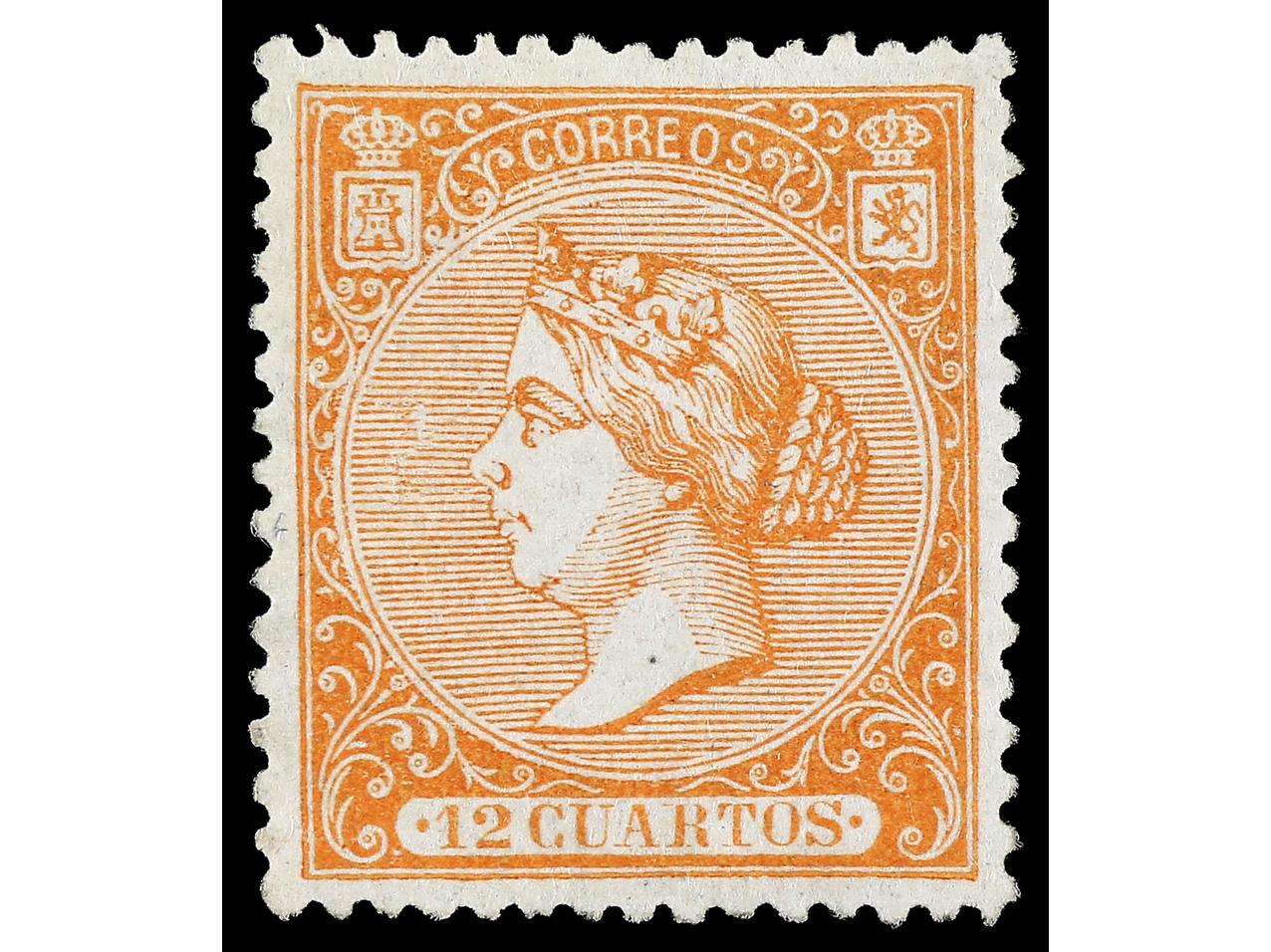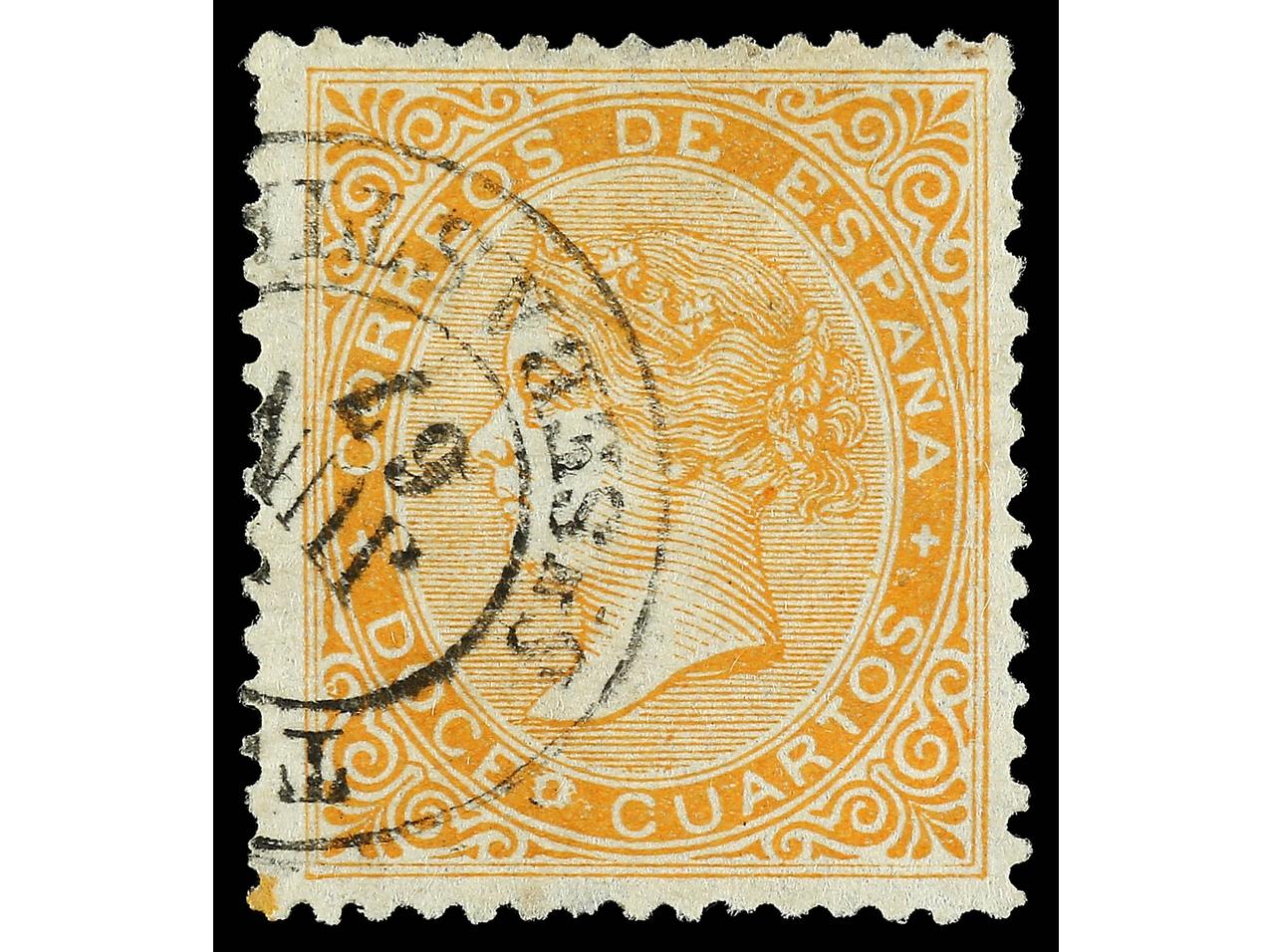 ESPAÑA. 12 cuartos naranja. Adorno inferior izquierdo entintado. Sello muy raro y no reseñado en nuevo. Ed.89itb. (Image1)