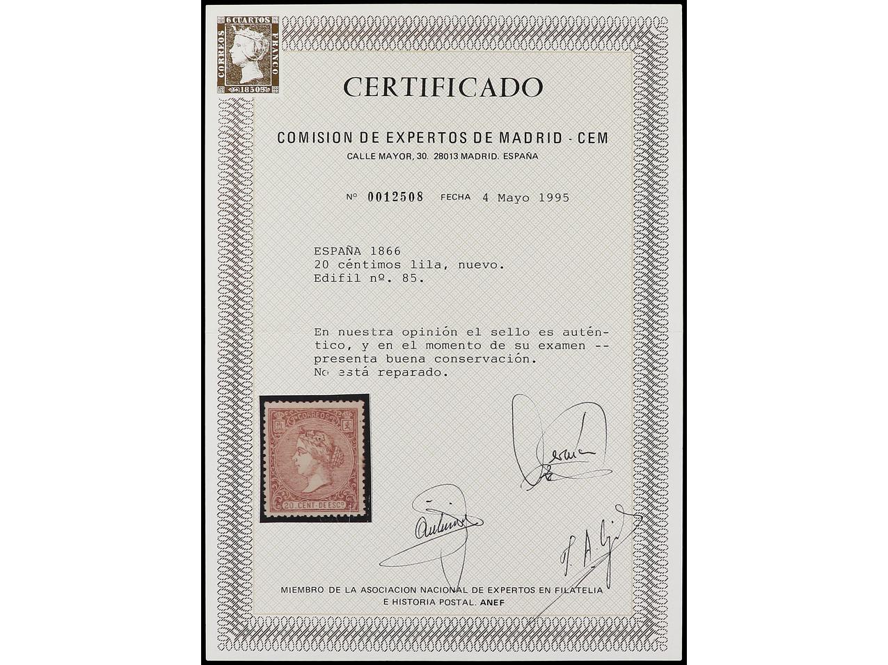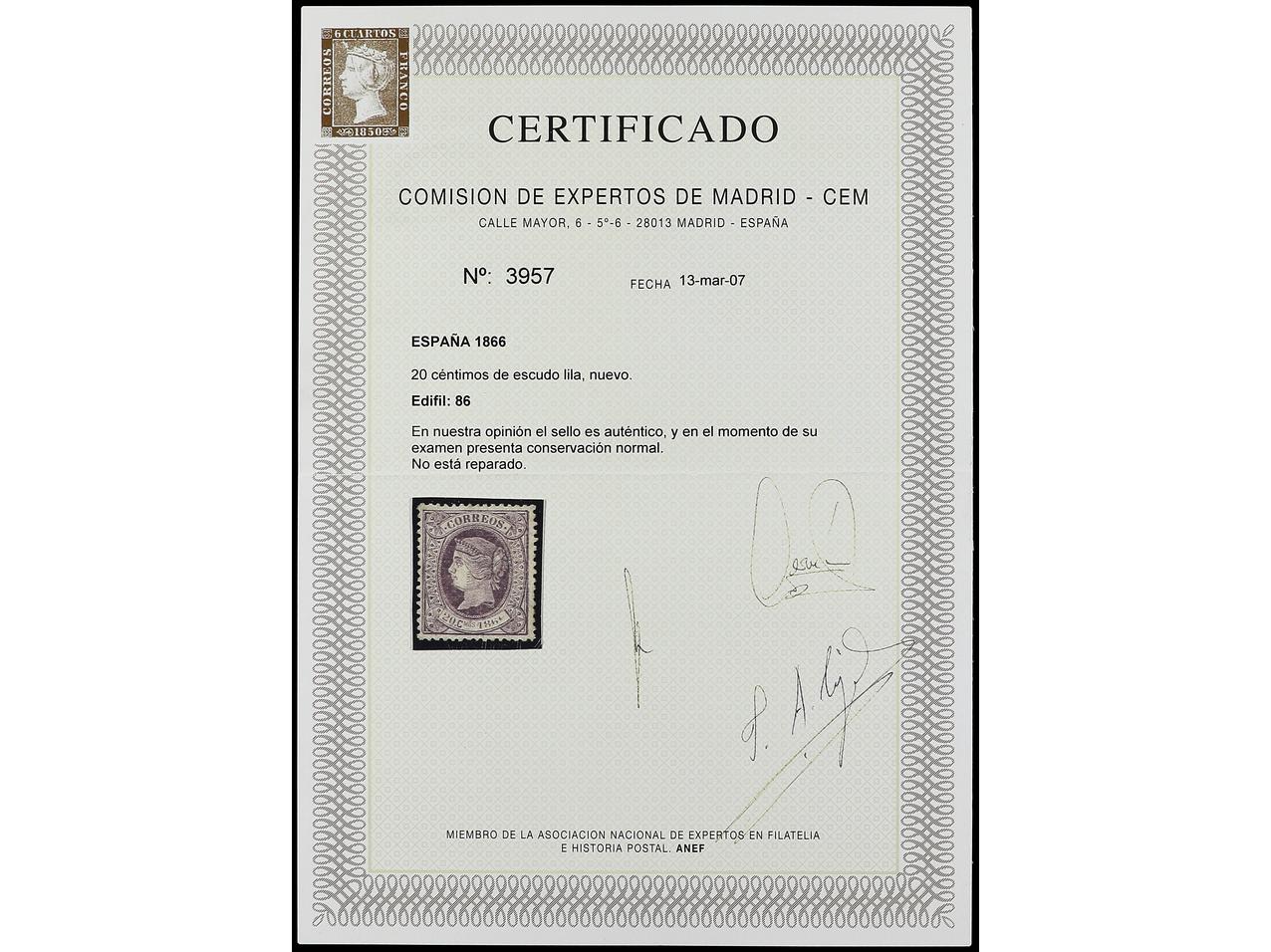 ESPAÑA. 20 céntimos lila. PIEZA DE LUJO. Cert. CEM. Ed.85. Cat. 350€. (Image1) (Image2)