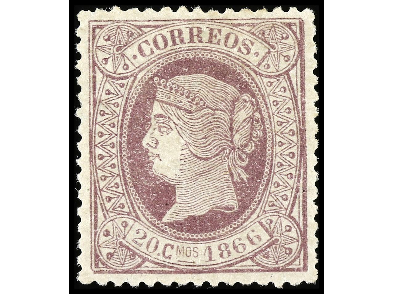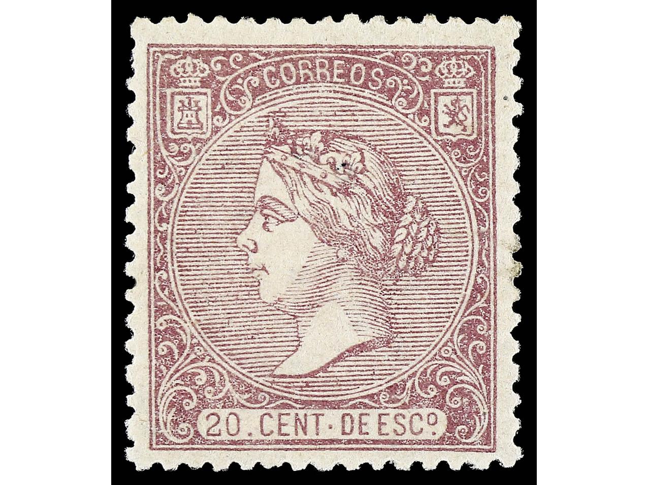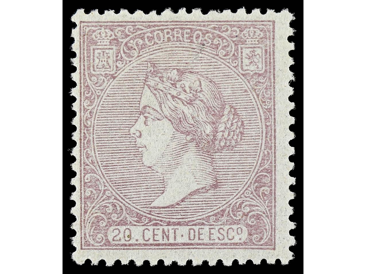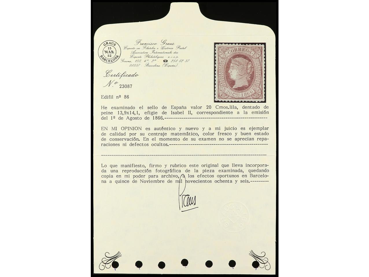 ESPAÑA. 20 cts. lila. Centraje perfecto, sello muy raro en esta calidad. LUJO. Cert. GRAUS. Ed.86. Cat. 1.800€. (Image1) (Image2)