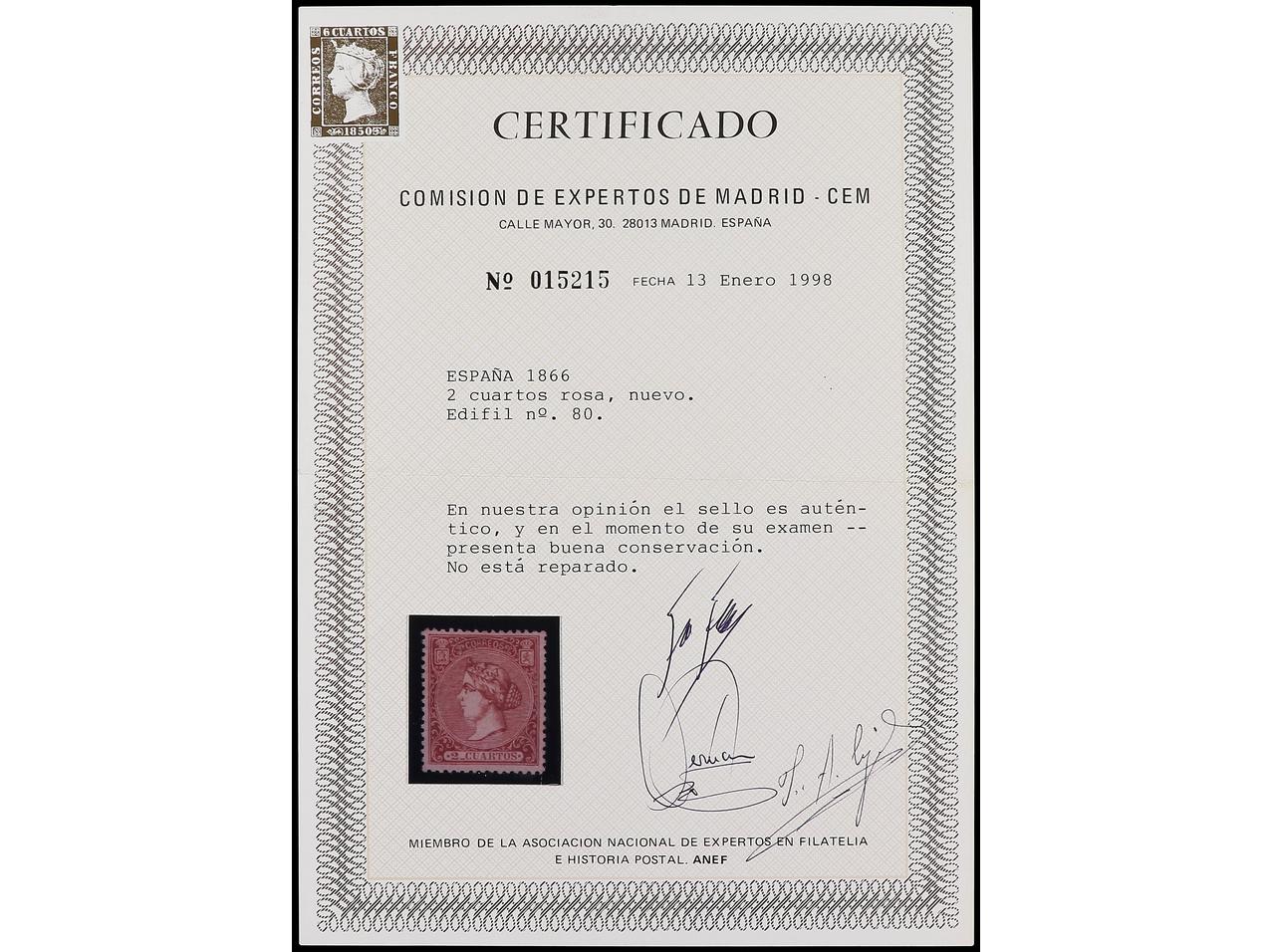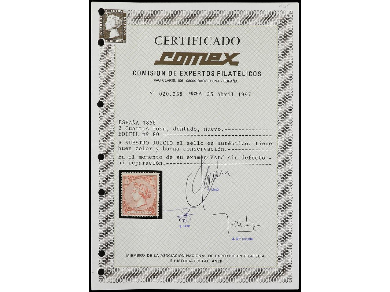 ESPAÑA. 2 cuartos rosa. Muy buen ejemplar. Cert. COMEX. Ed.80. (Image1) (Image2)