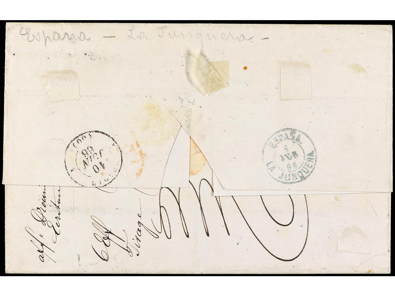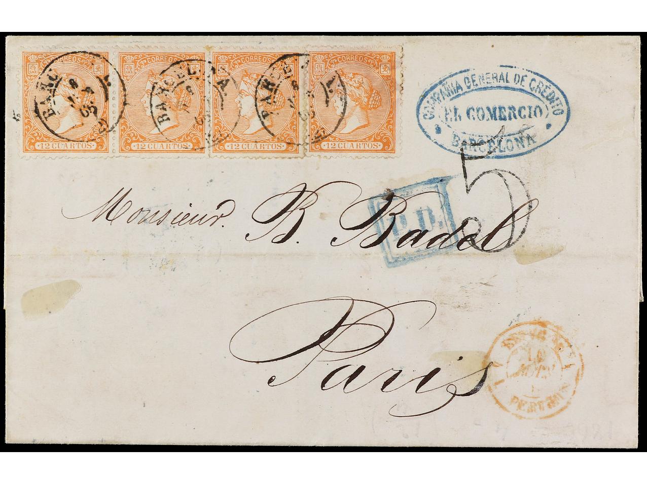 ESPAÑA. 1866. BARCELONA a PARIS. 12 c. naranja (4) y mat. fechador. Tarifa de 4 portes. (Image1) (Image2)