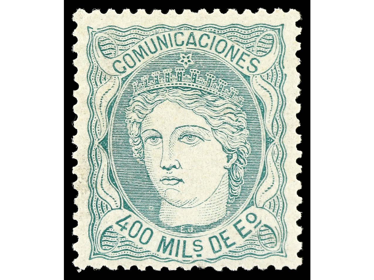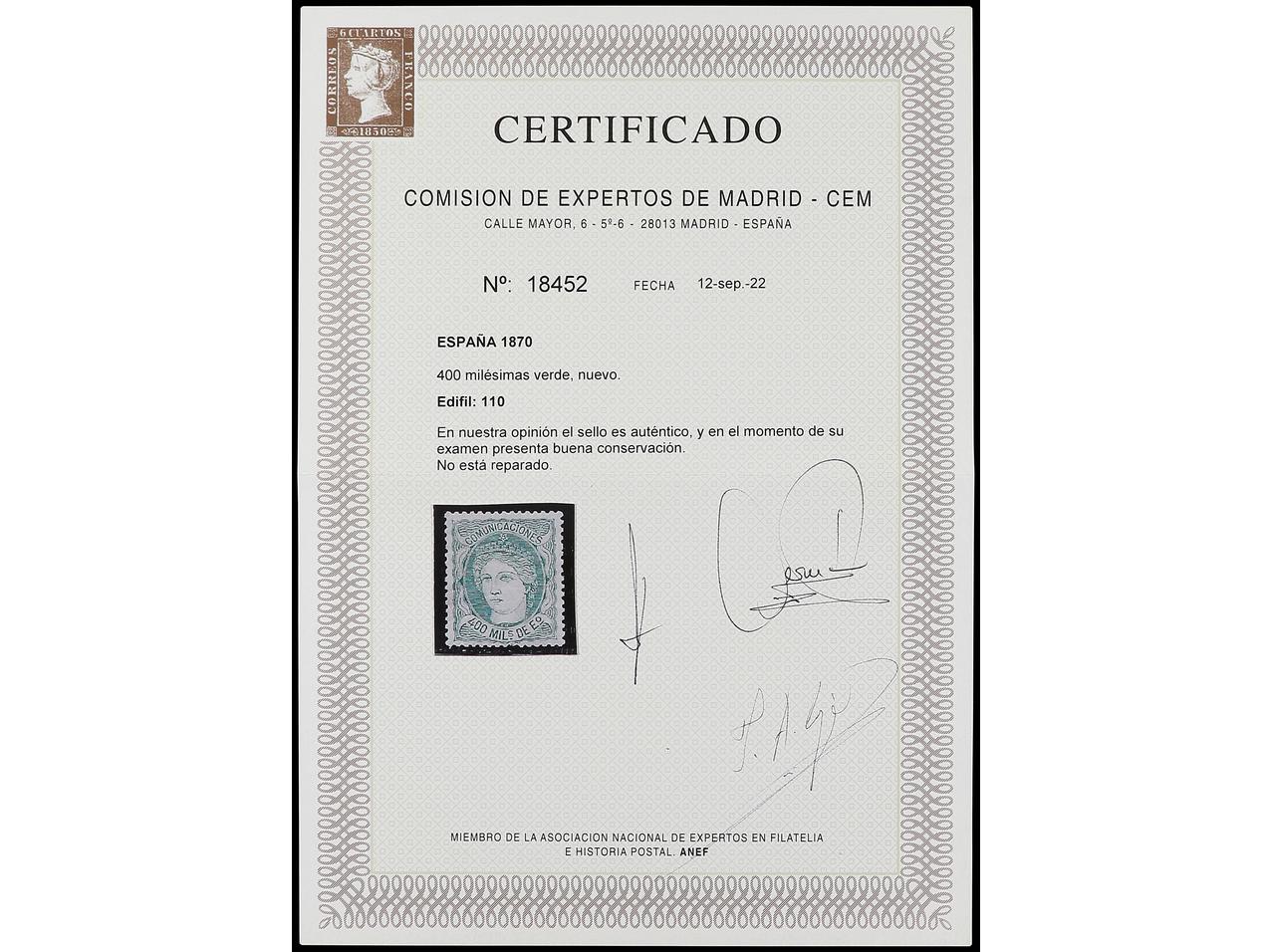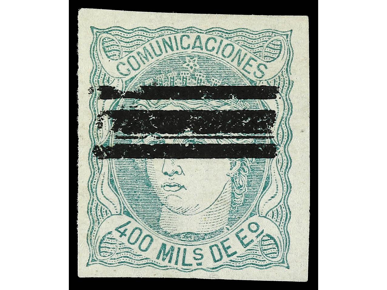 ESPAÑA. 400 mils. verde SIN DENTAR. Ejemplar barrado procedente de los sellos de canje (solo se conoce así). Muy pocos ejemplares conocidos. FIRMADO GRAUS. Ed.110. (Image1)