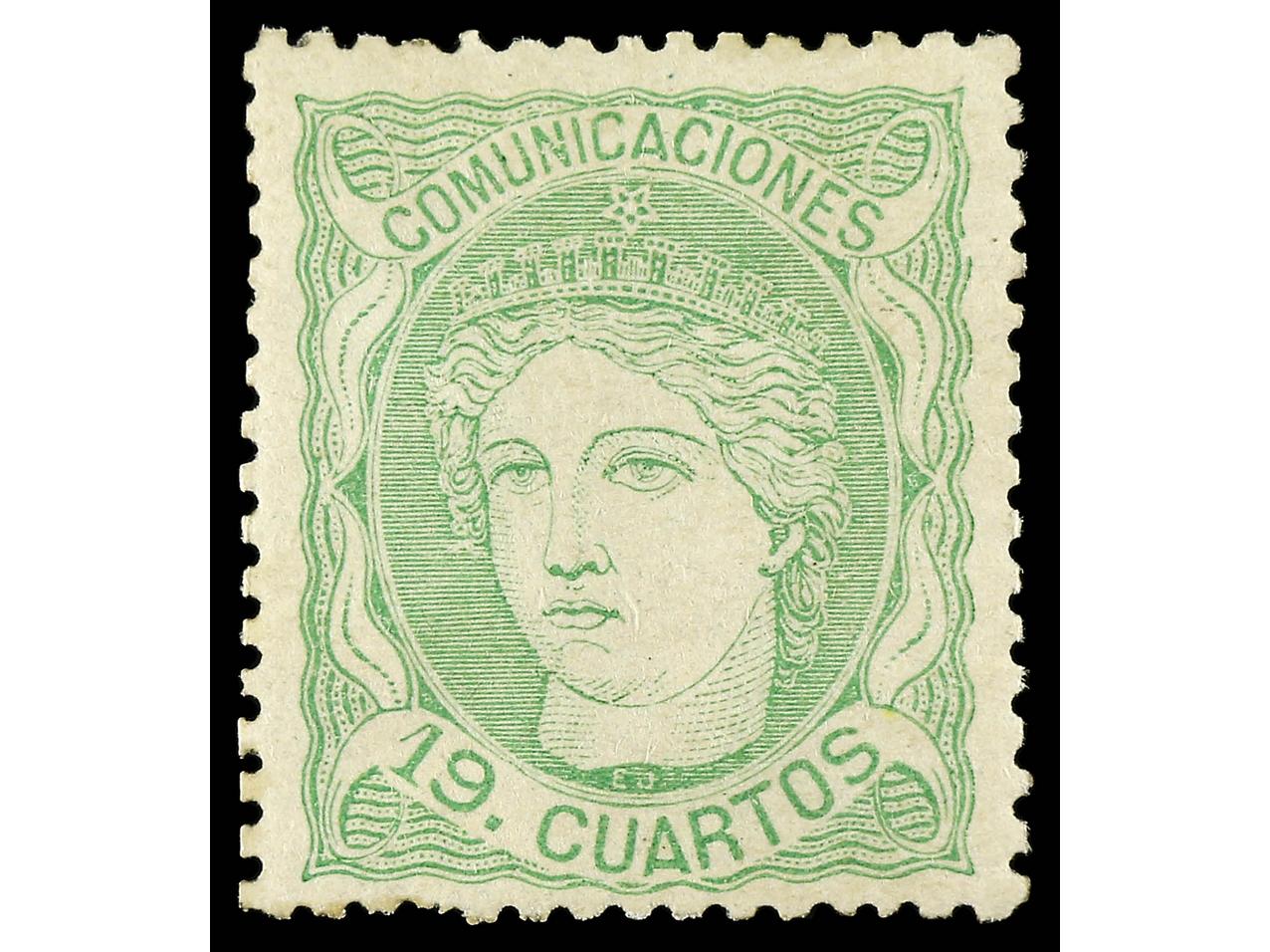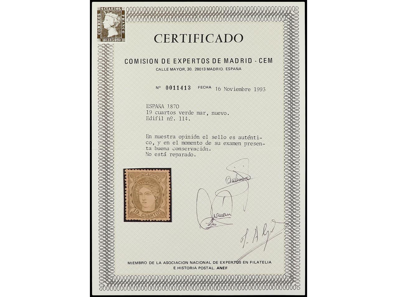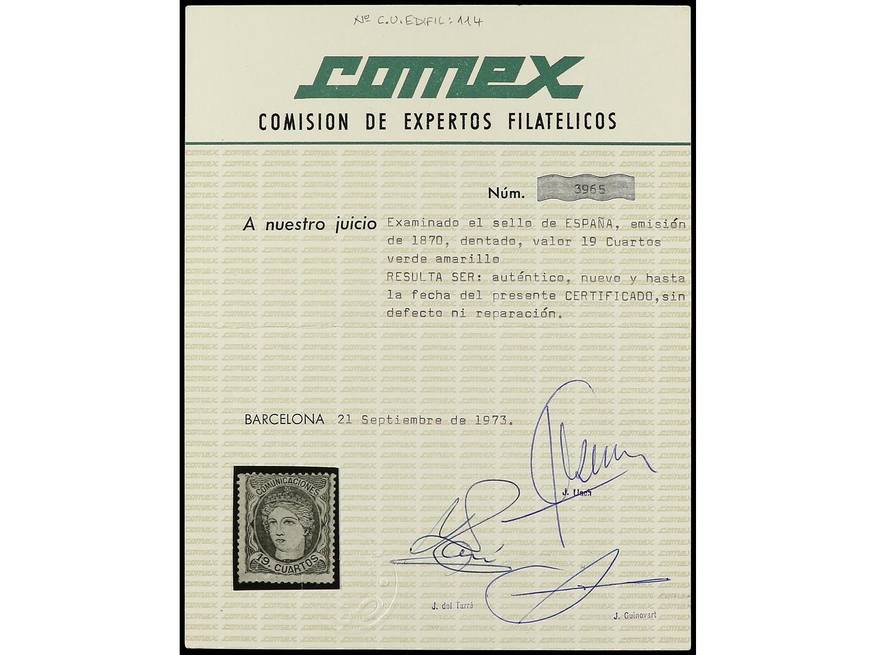 ESPAÑA. 19 cuartos verde. Buen ejemplar. Cert. COMEX (1973). Ed.114. Cat. 350€. (Image1) (Image2)