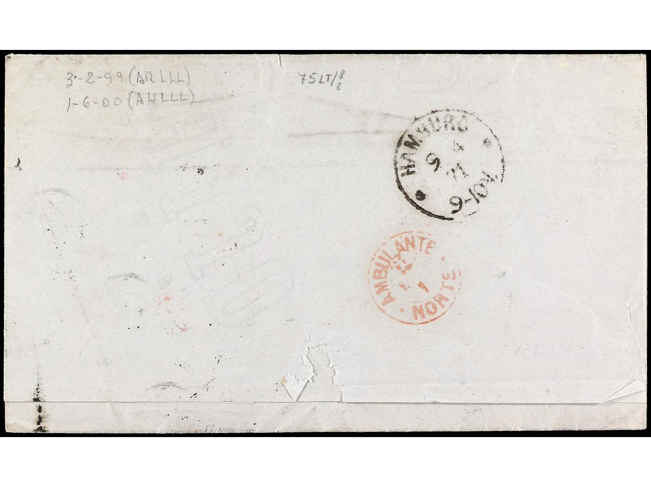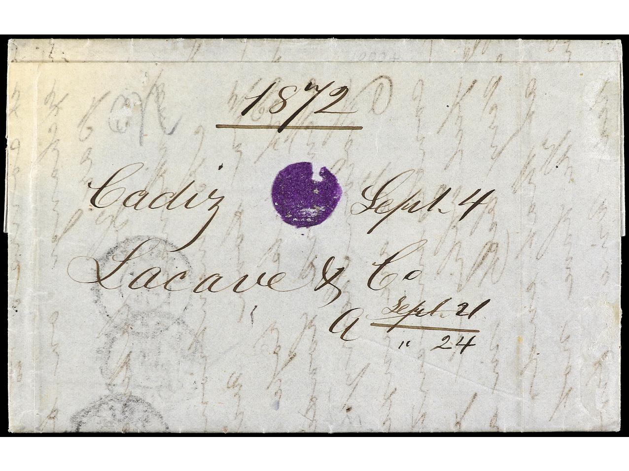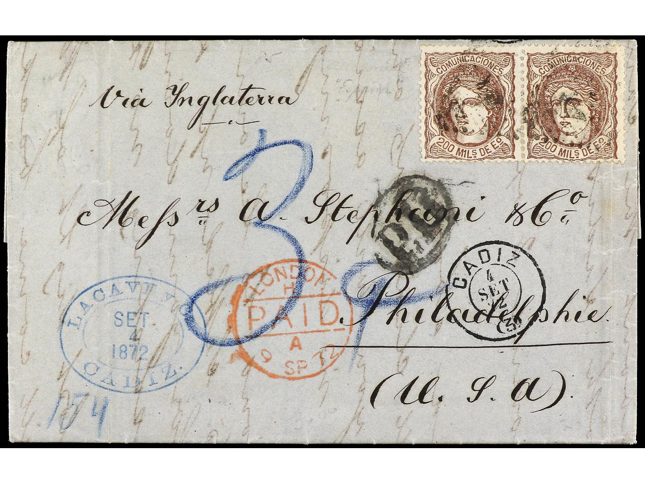 ESPAÑA: PREFILATELIA. 1872. CADIZ a USA. 200 mil. (2), mat. rombo de punto. Tarifa de 1 porte por la vía de Londres. Ed.109. (Image1) (Image2)