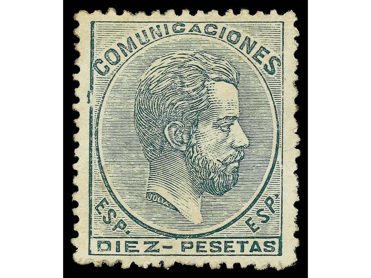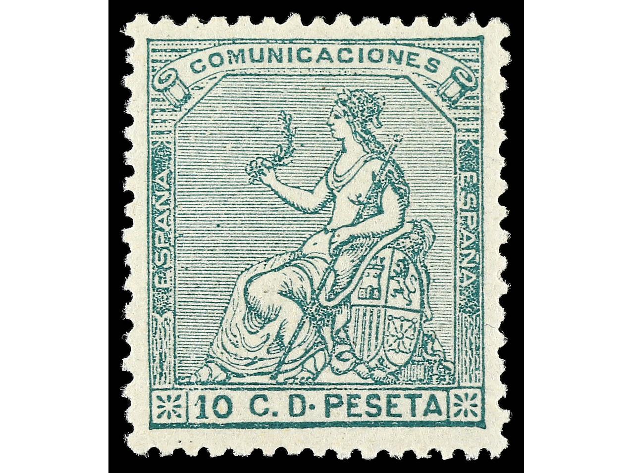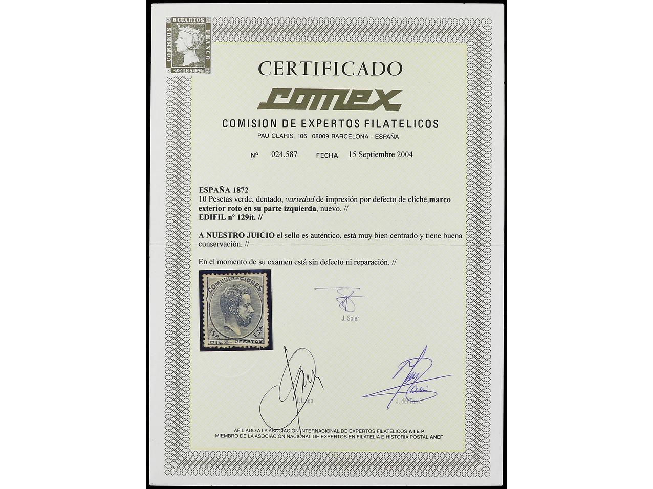 ESPAÑA. 10 pts. verde. MARCO ROTO en el margen izquierdo. Sello de centraje perfecto, rarísimo y más en esta calidad. Cert. COMEX. Ed.129it.