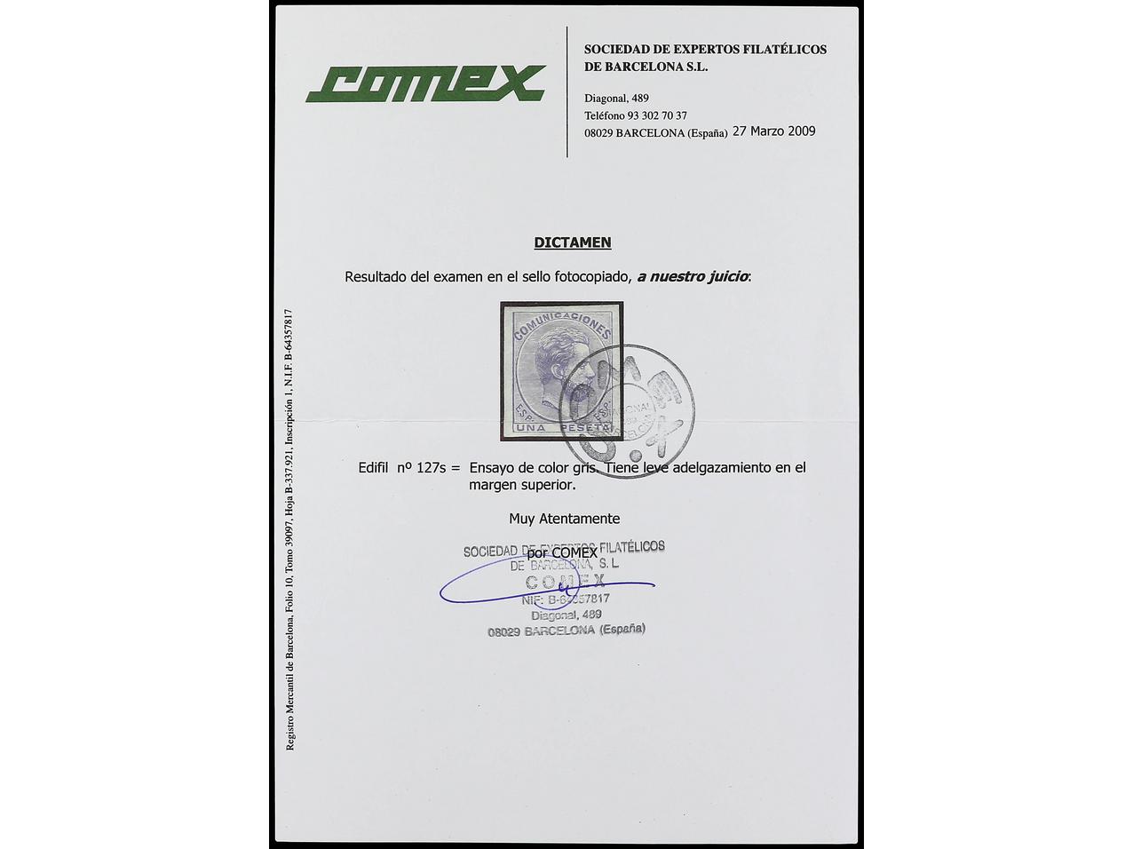 ESPAÑA. ENSAYO DE COLOR. 1 pta. violeta, leve punto claro, no reseñado en Galvez. Dictament COMEX. Ed.127. (Image1) (Image2)