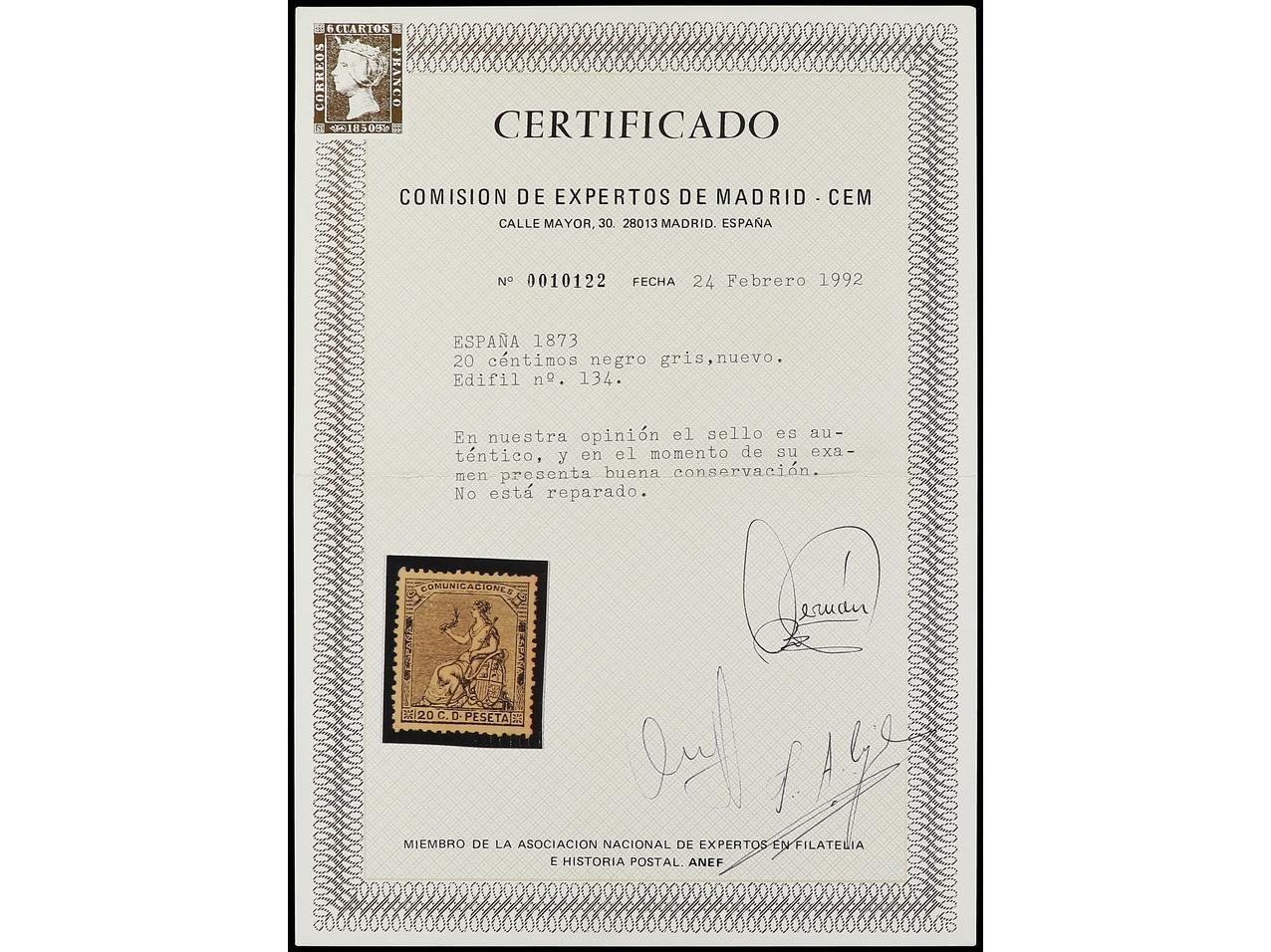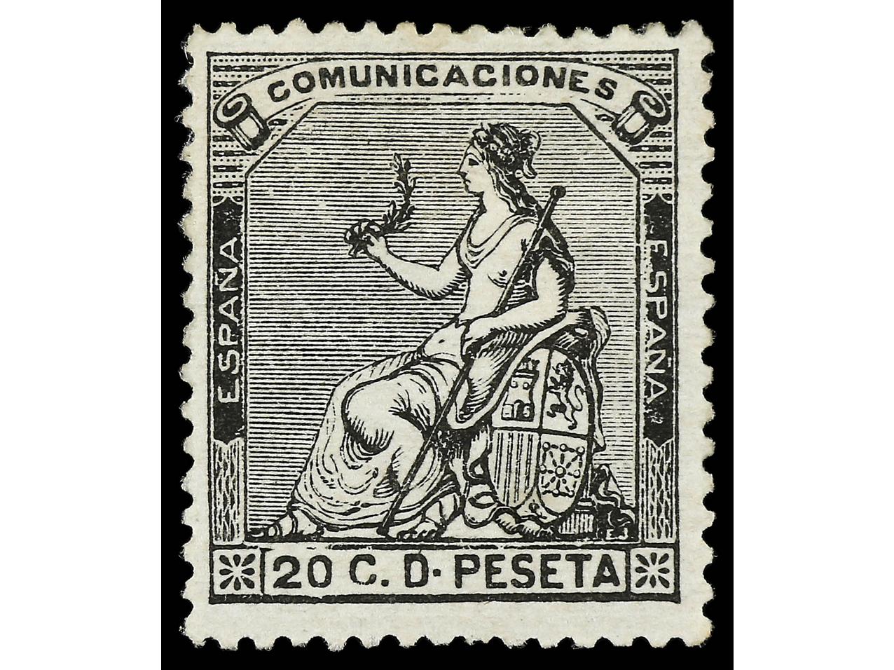 ESPAÑA. 20 céntimos negro. PIEZA DE LUJO. Cert. CEM. Ed.134. (Image1)