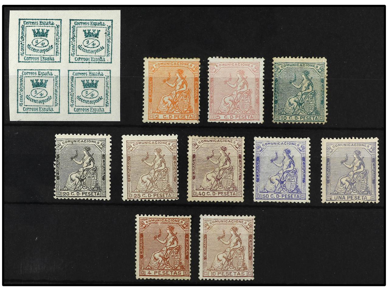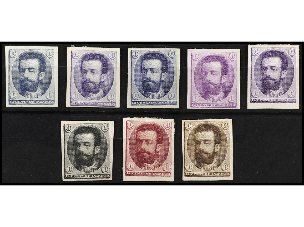 ESPAÑA. 1872. PROYECTOS NO ADOPTADOS. Ensayos de plancha sobre cartulina. Conjunto de 8 sellos (Gálvez 836/41) más variedades de color. (Image1)