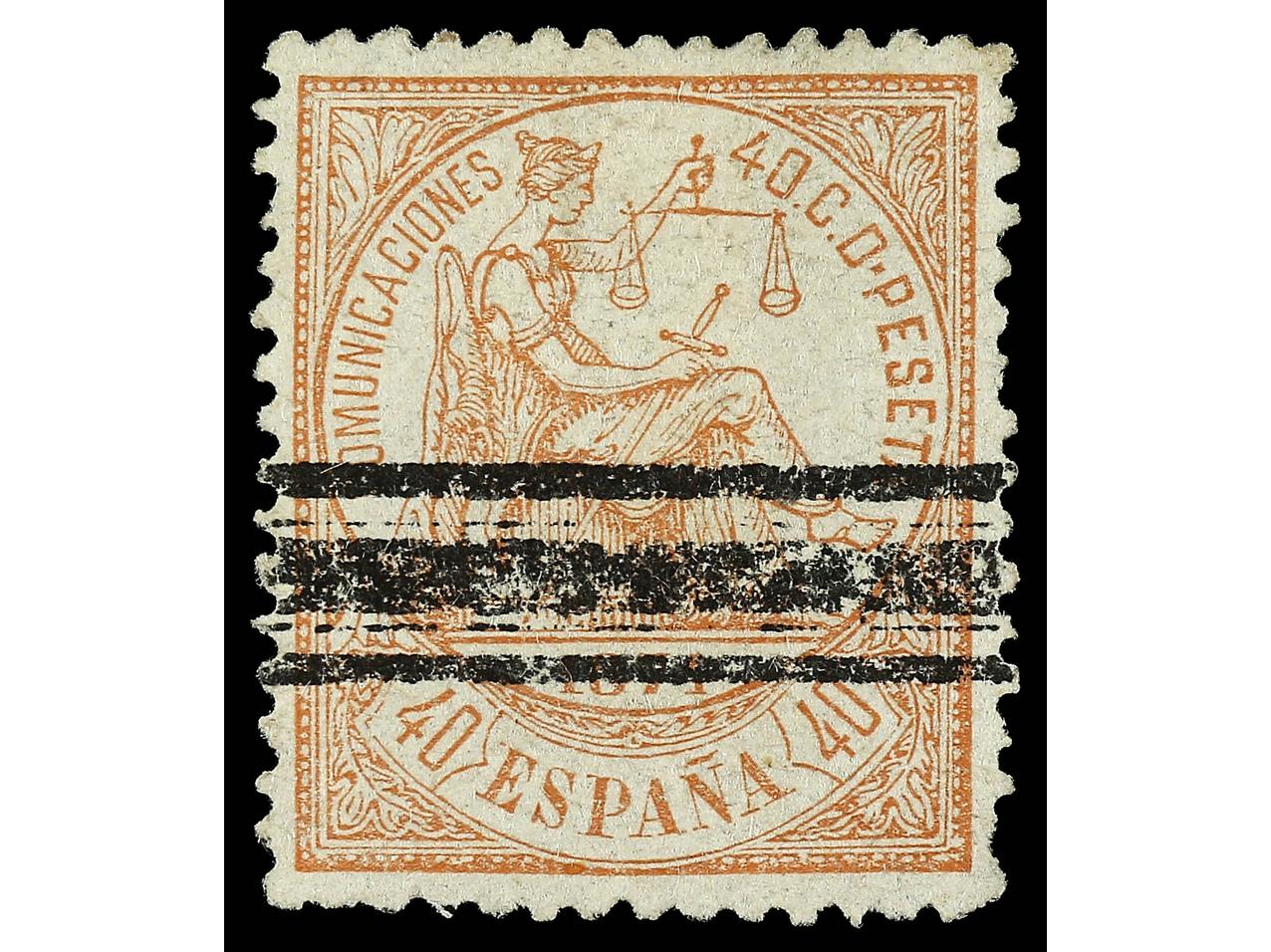 ESPAÑA. 40 cts. castaño ERROR DE COLOR, sello con el papel normal de la emisión y barrado. PIEZA EXCEPCIONAL, solo reseñado sobre papel cartón, de este ejemplar con el papel original del tiraje se conocen muy pocos ejemplares. Cert.