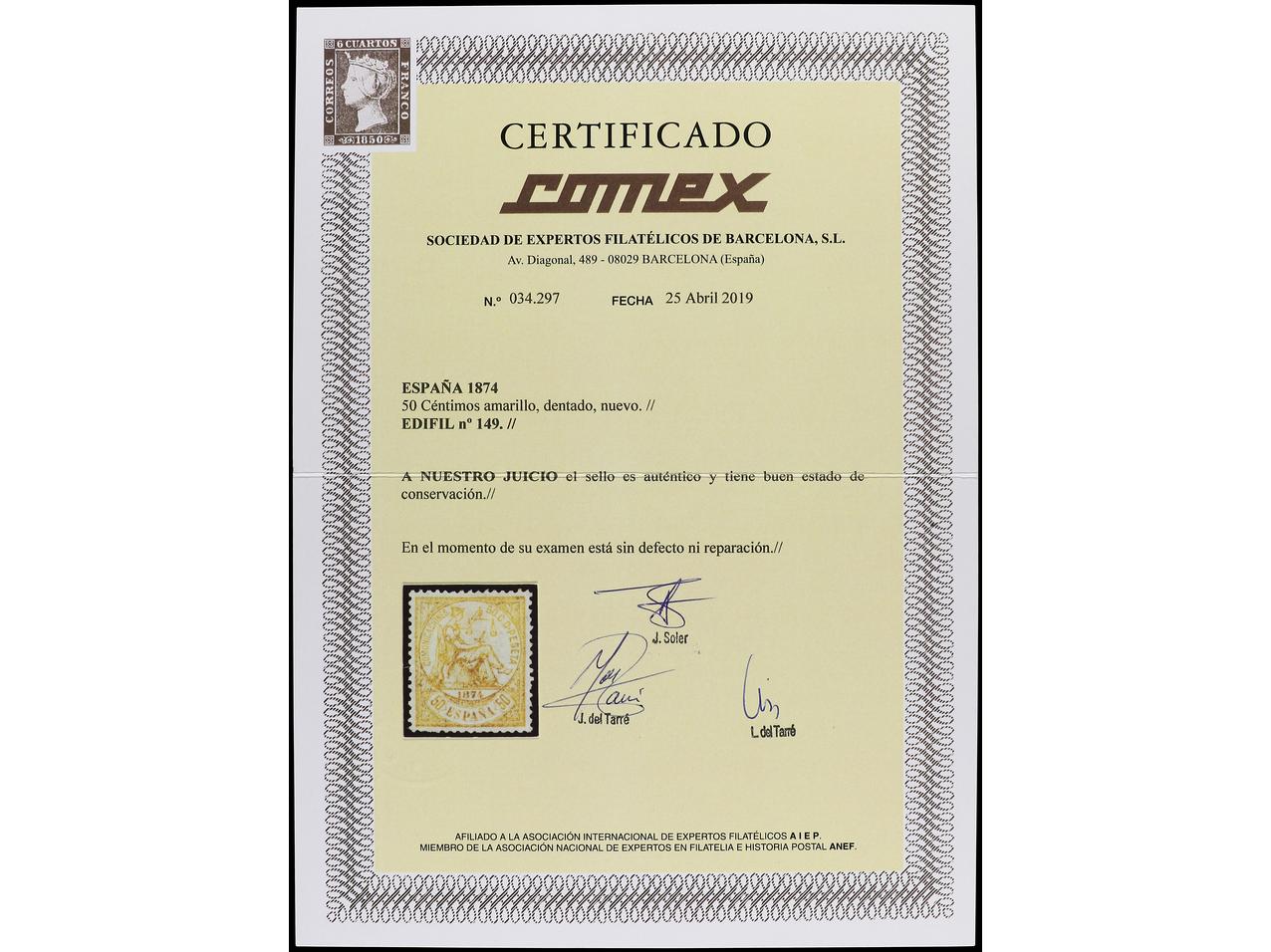 ESPAÑA. 50 cts. amarillo. LUJO. Cert. COMEX. Ed.149. (Image1)