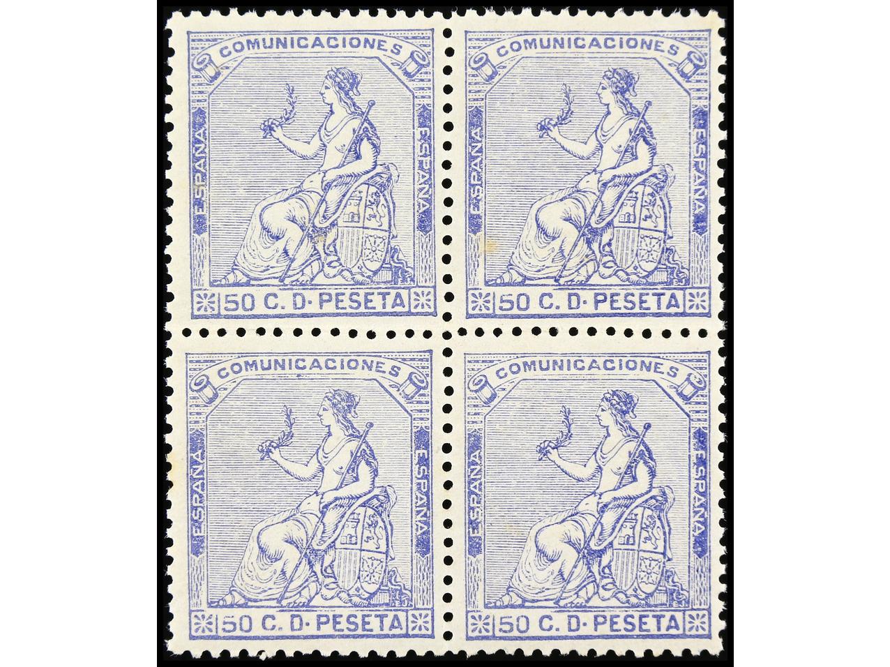 ESPAÑA. 50 cts. azul. Bloque de cuatro, tres sellos sin fijasellos, excelente centraje, alguna leve mancha del tiempo. Ed.137. (Image1)