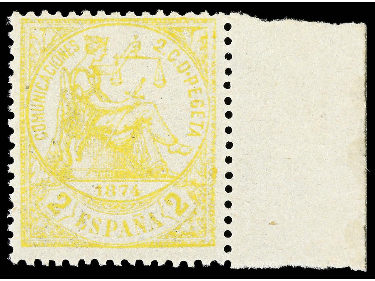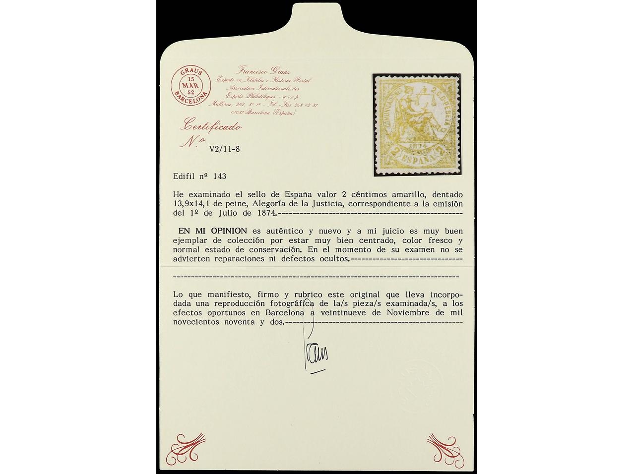 ESPAÑA. 2 céntimos amarillo. LUJO. Cert. GRAUS. Ed.143. (Image1)