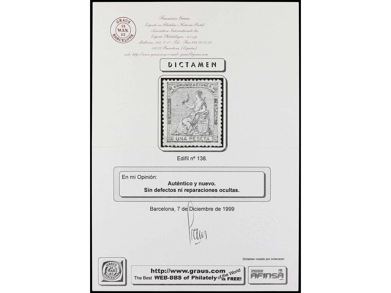 ESPAÑA. 1 peseta lila. PIEZA DE LUJO. Ed.138. (Image1)