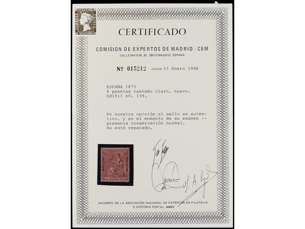 ESPAÑA. 4 pesetas castaño. PIEZA DE LUJO. Cert. CEM. Ed.139. Cat. 1.100€. (Image1) (Image2)