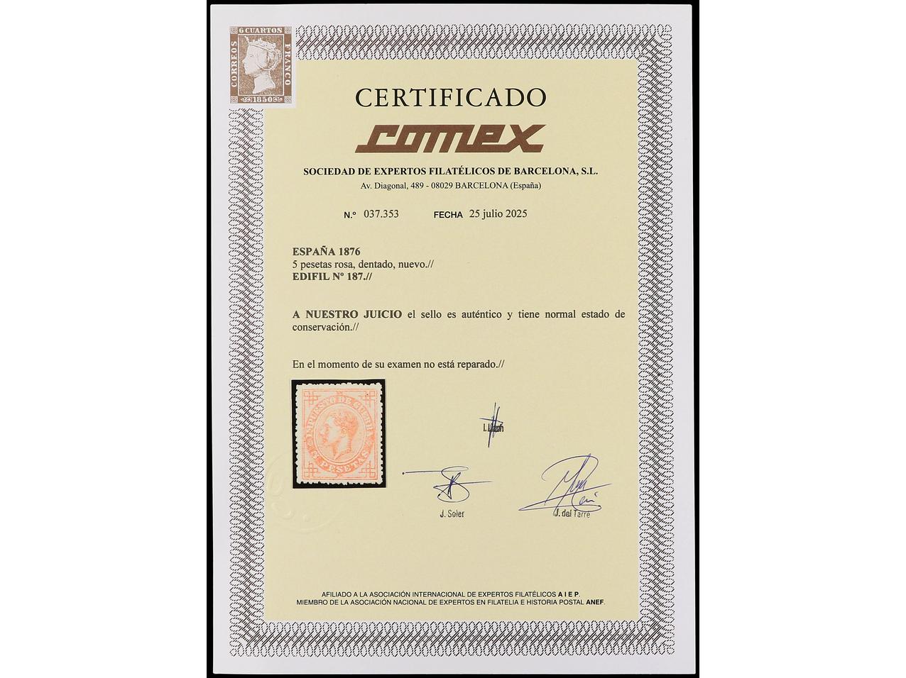 ESPAÑA. 5 pts. rojo. Magnífico ejemplar. Excelente centraje. Cert. COMEX. Ed.187. Cat. 1.350€. (Image1) (Image2)