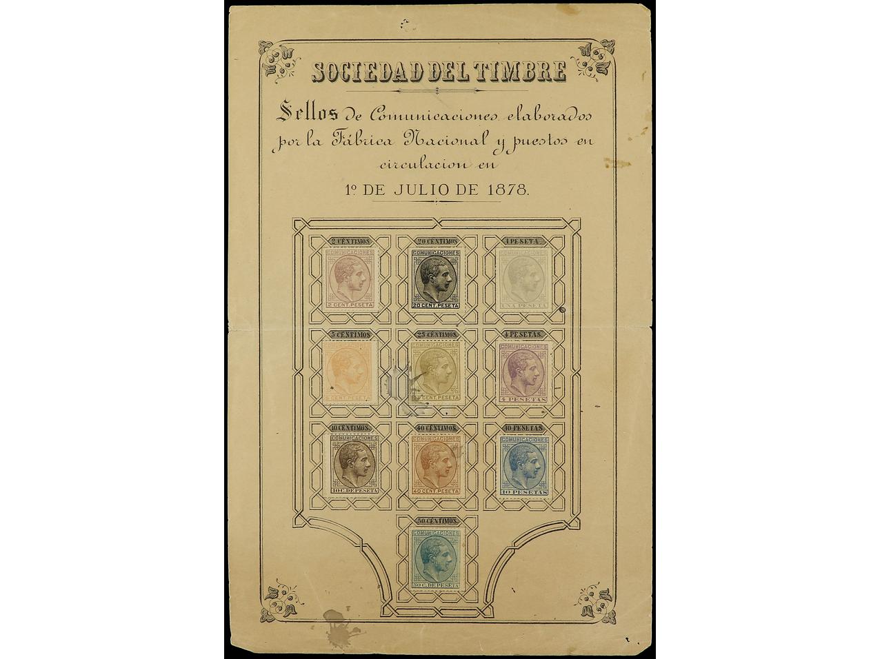 ESPAÑA. HOJA MODELO para la emisión de 1 de Julio de 1878 con los sellos de la serie adheridos, dos manchas de tinta difusas. MUY RARA. Ed.190/99. Cat. 1.550€.