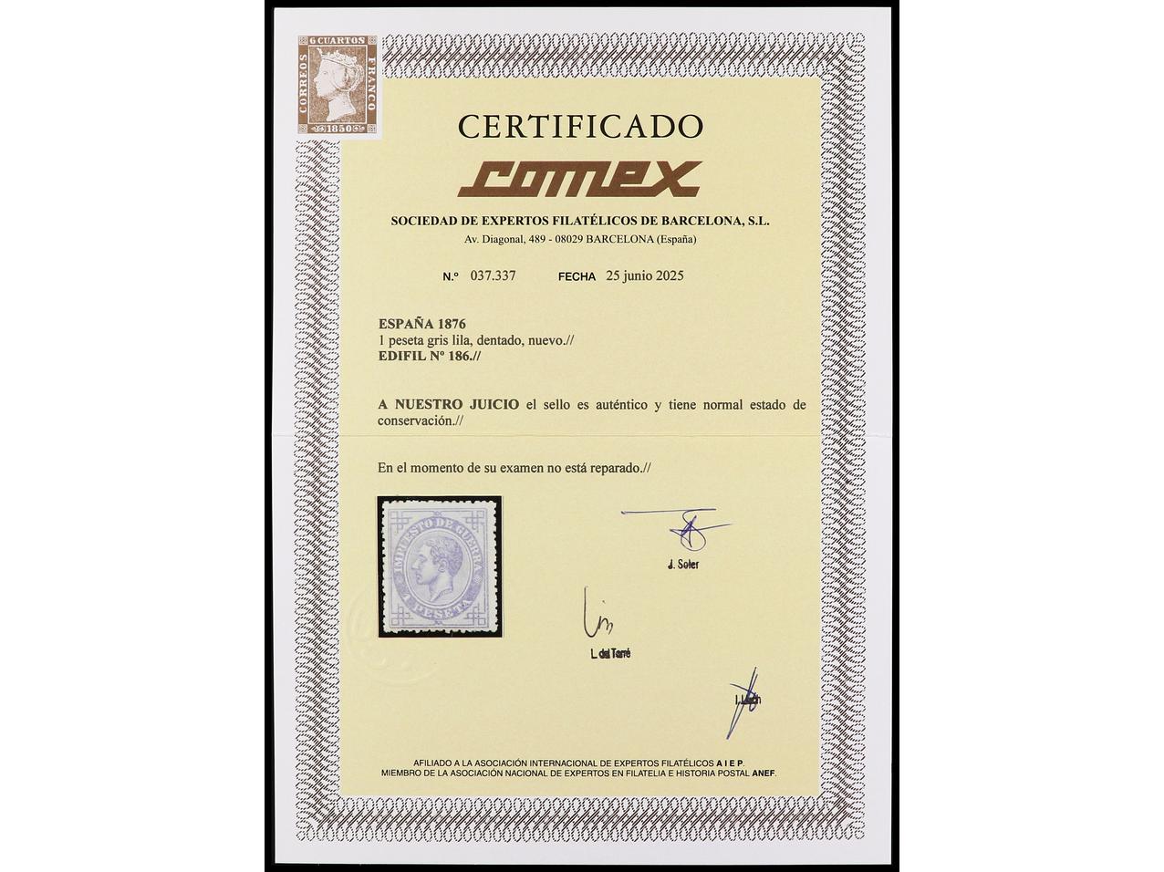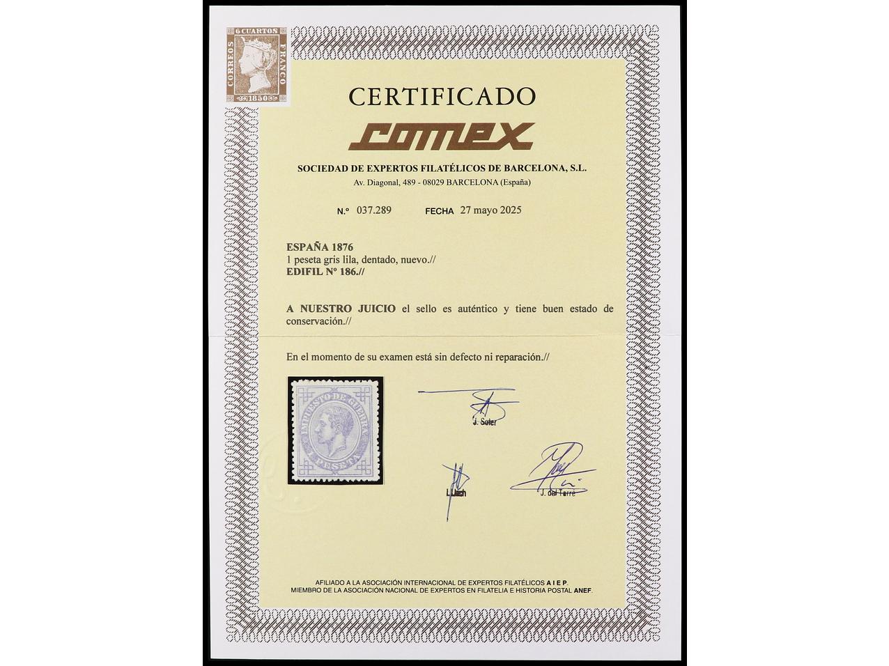 ESPAÑA. 1 peseta gris. Color muy fresco. Muy bonito ejemplar. Cert. COMEX. Ed.186. (Image1) (Image2)