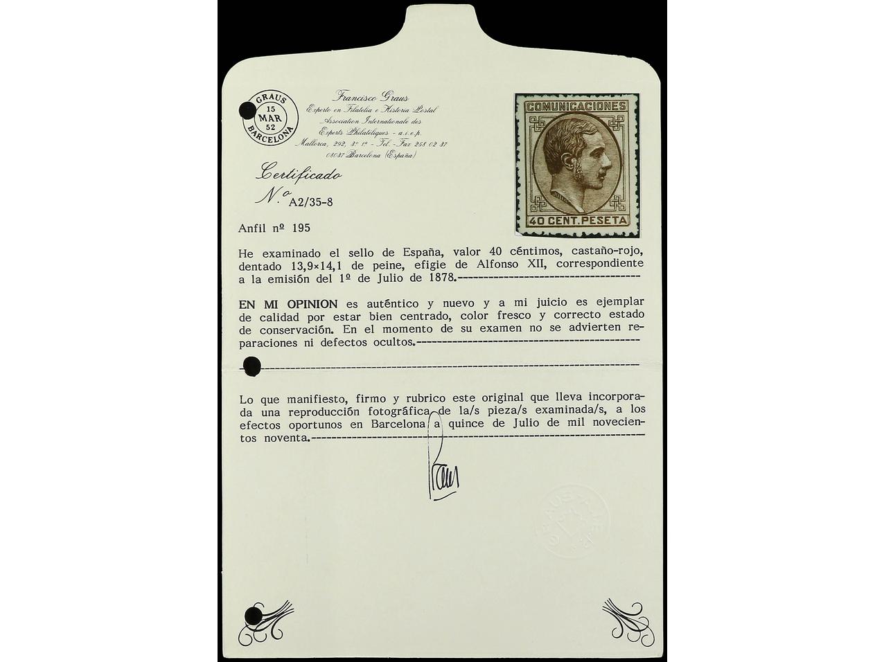 ESPAÑA. 40 céntimos castaño. PIEZA DE LUJO. Cert. GRAUS. Ed.195. Cat. 270€. (Image1) (Image2)