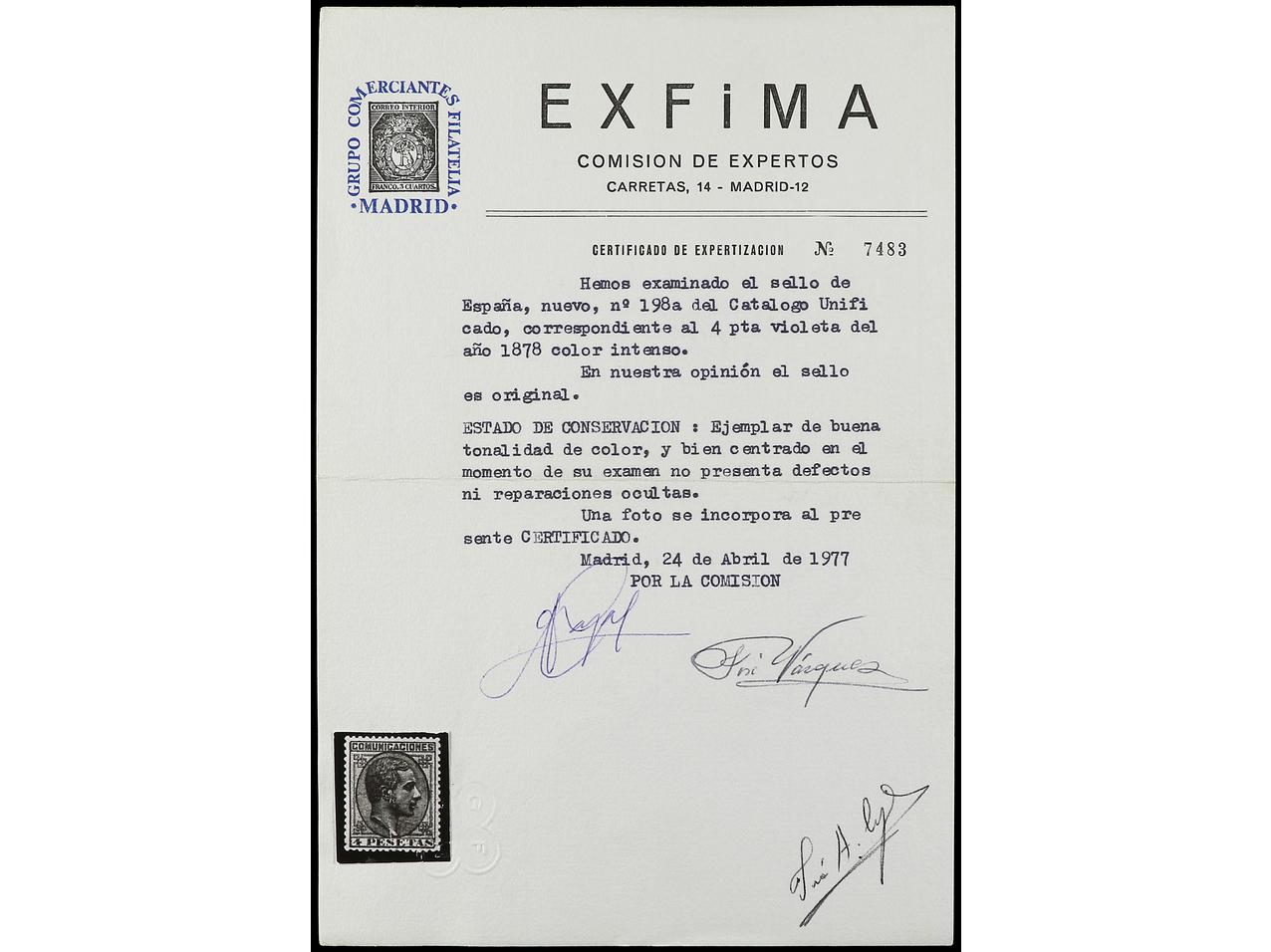ESPAÑA. 4 pesetas violeta. Muy bien centrado. Cert. EXFIMA. Ed.198. Cat. 350€. (Image1) (Image2)