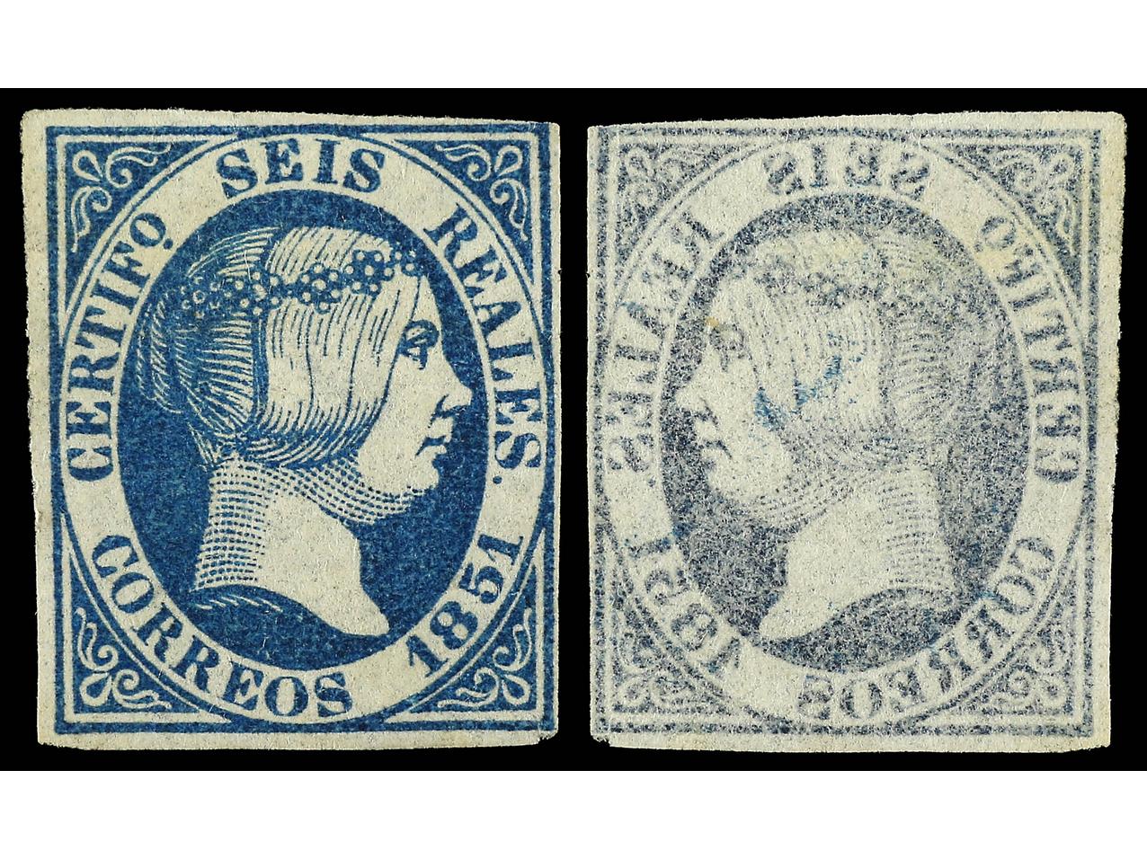 ESPAÑA. 6 reales azul. Impresión CALCADA al dorso. MUY RARO y no reseñado. Cert. E. SORO. Ed.10. (Image1) (Image2)
