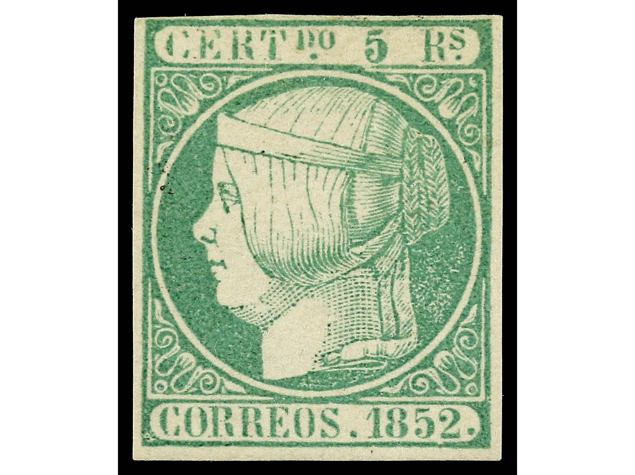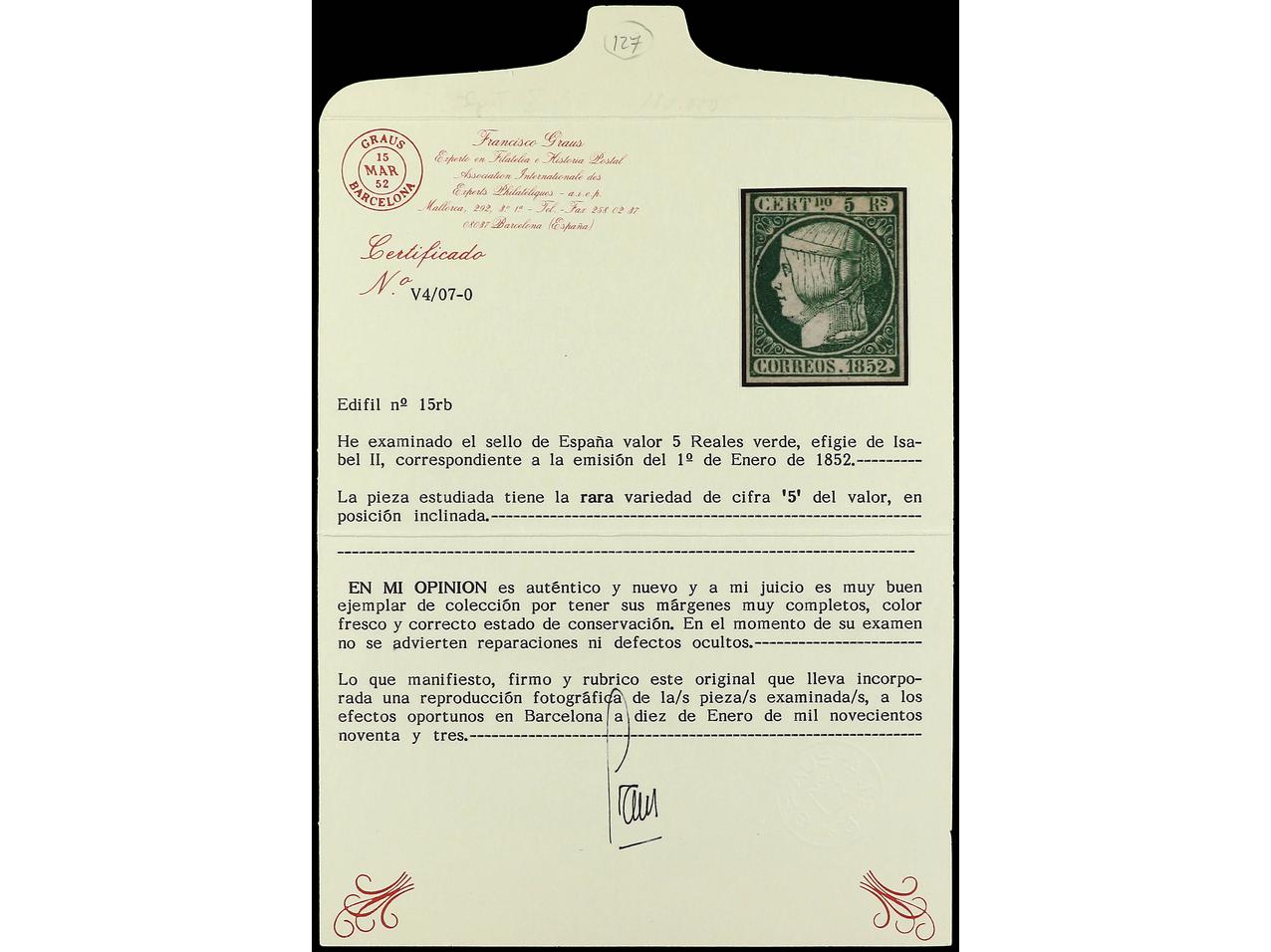 ESPAÑA. 5 reales verde. Cifra ´5´ del valor INCLINADA. Rara variedad y más en nuevo. Cert. GRAUS. Ed.15itb. Cat. 4.200€. (Image1) (Image2)