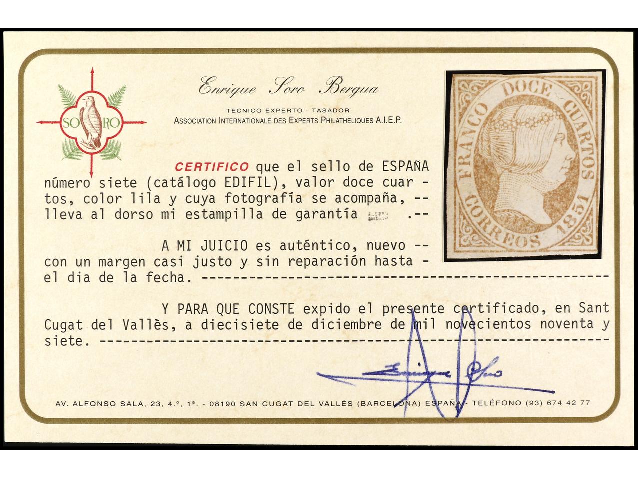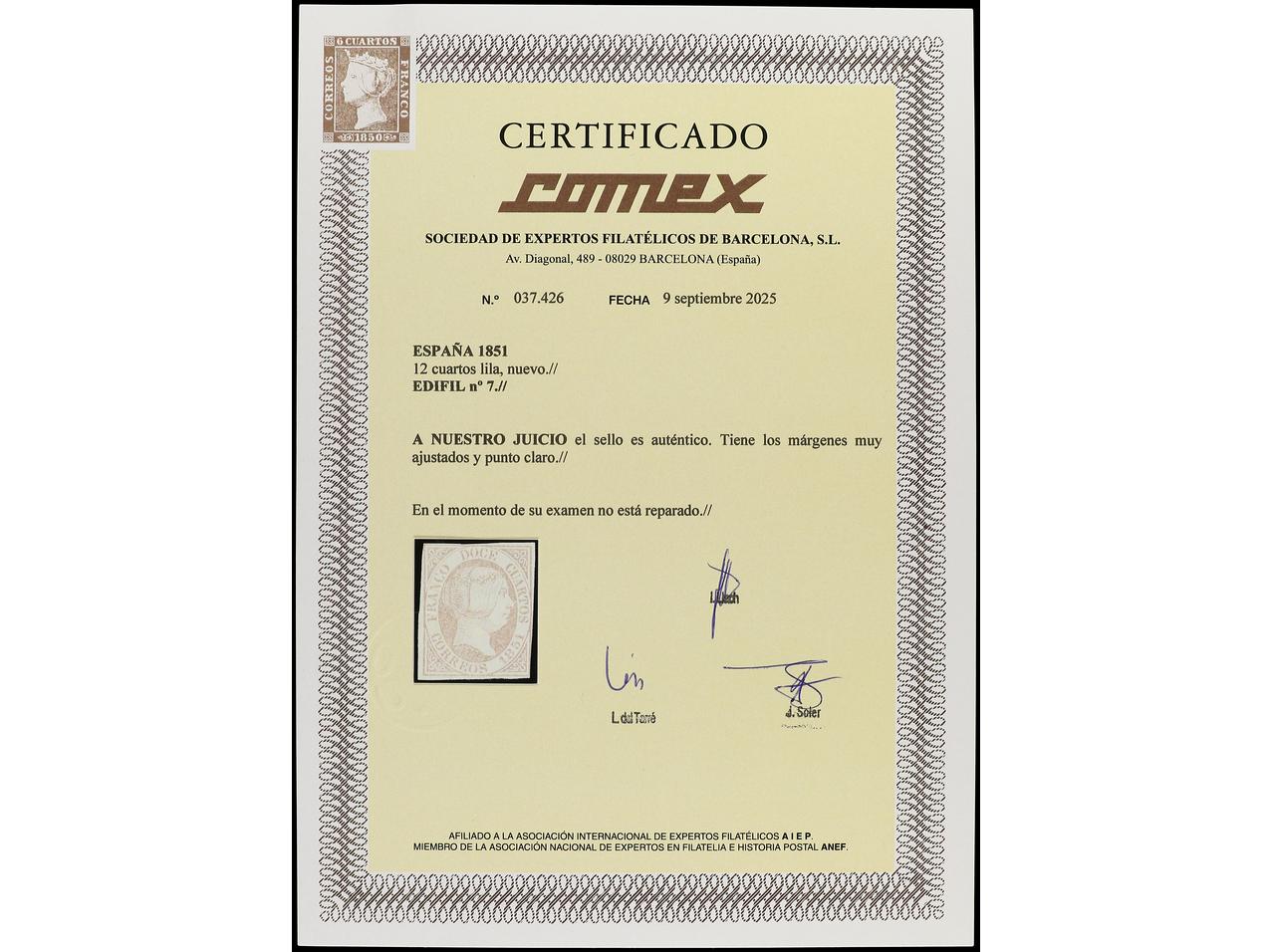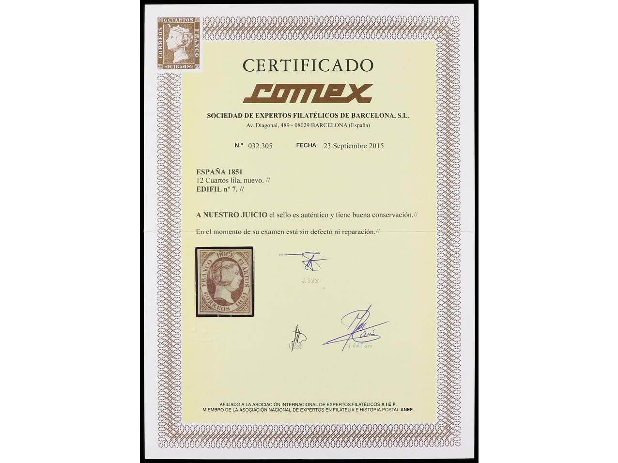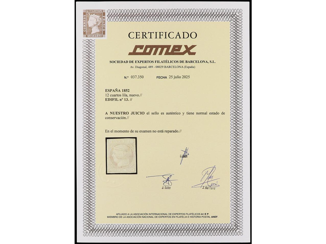 ESPAÑA. 12 cuartos lila oscuro, color muy fresco, sello muy raro en nuevo. LUJO. Cert. COMEX. Ed.7. Cat. 6.000€. (Image1) (Image2)