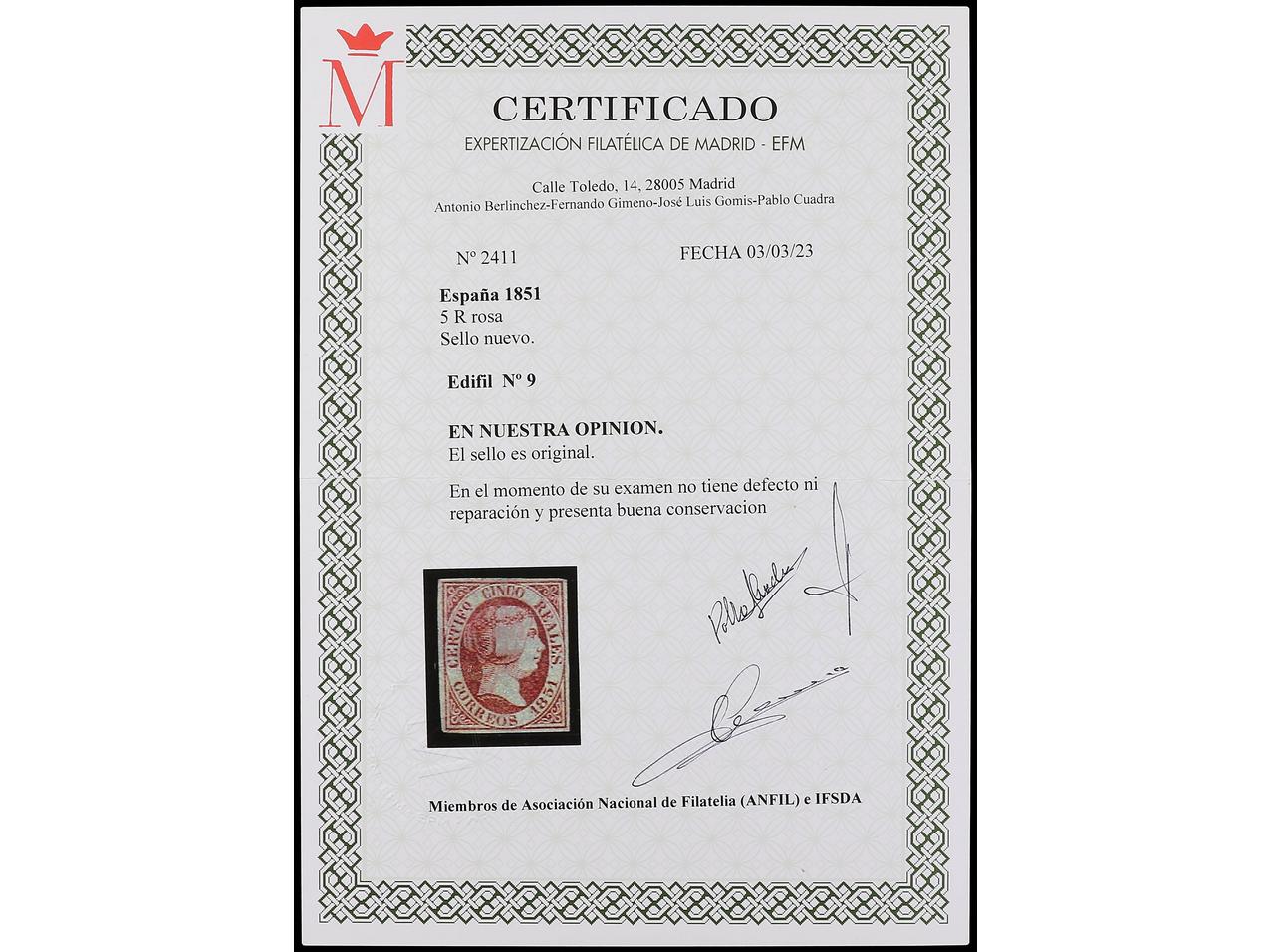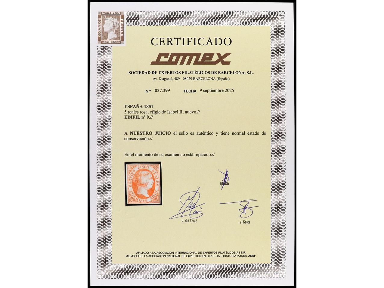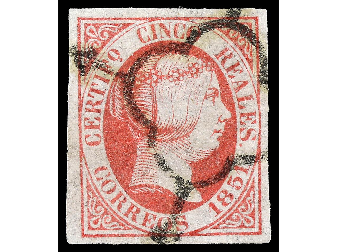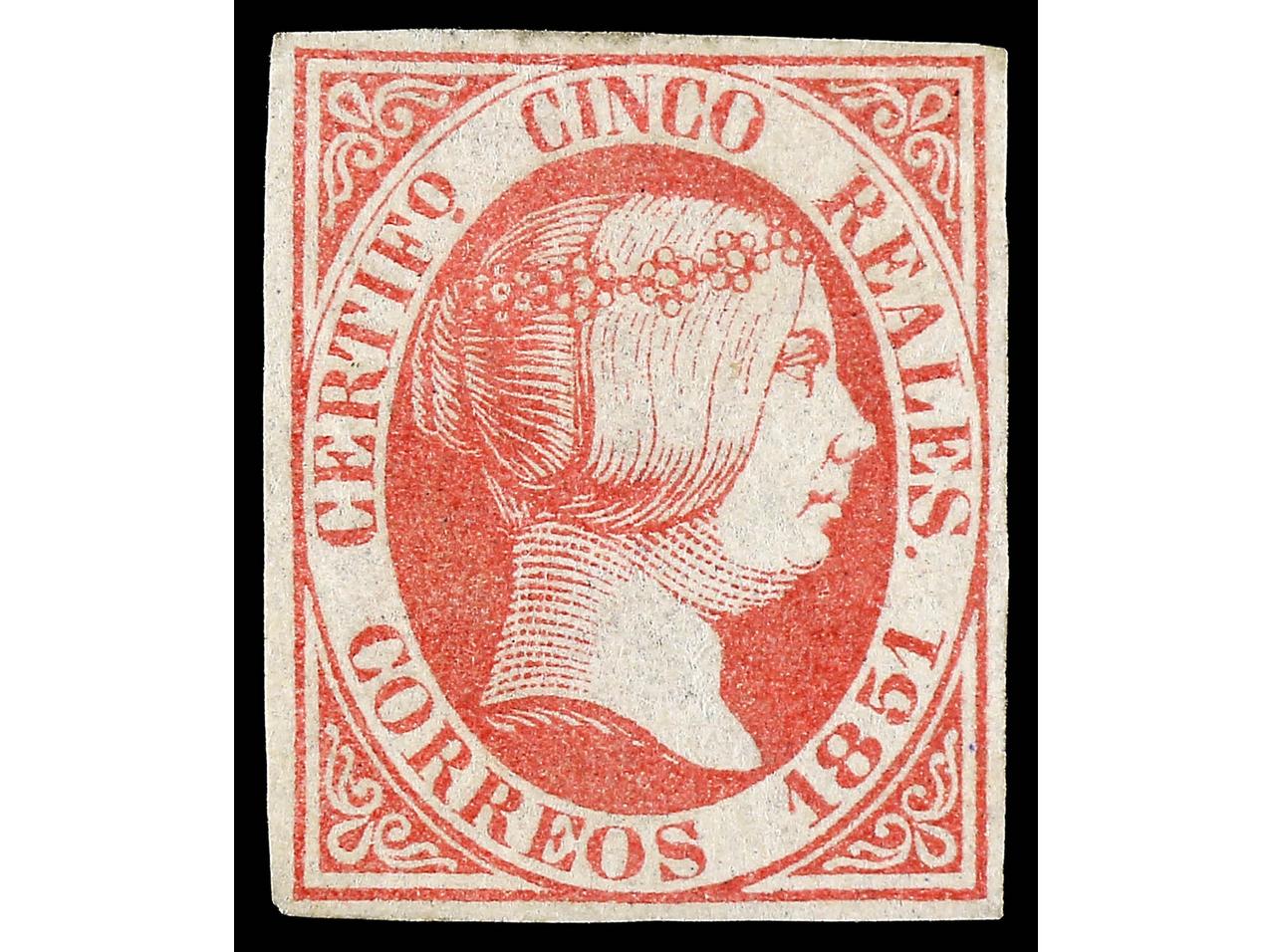 ESPAÑA. 5 reales rosa. Buenos márgenes. Muy buen ejemplar. Cert. COMEX. Ed.9. (Image1) (Image2)