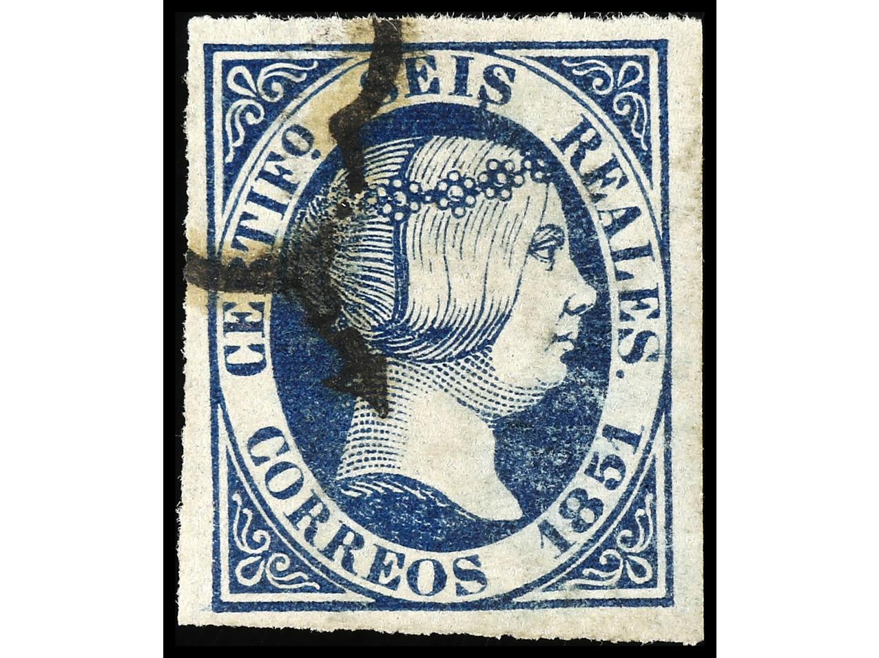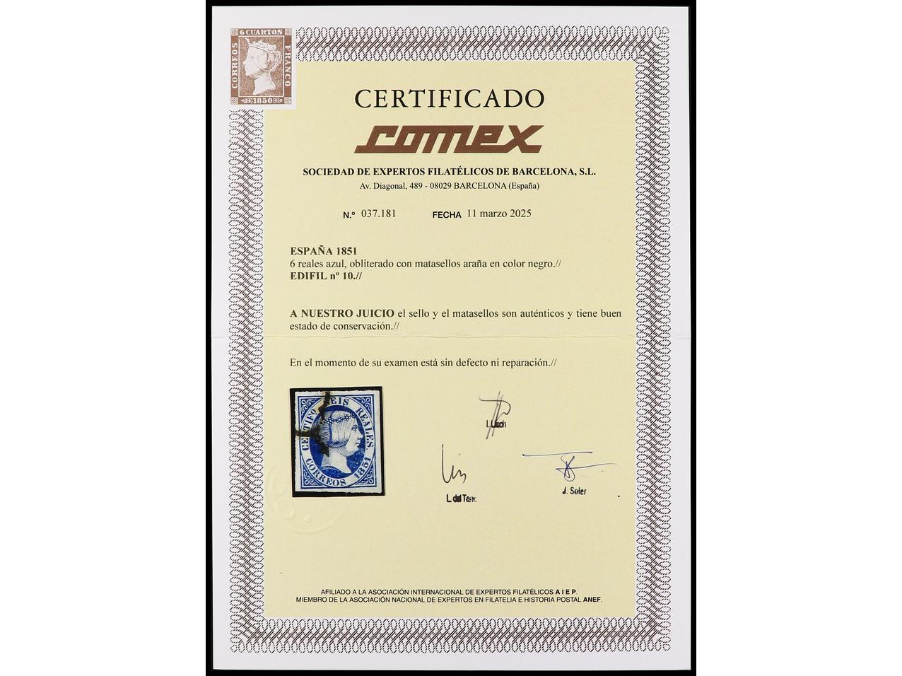 ESPAÑA. 6 reales azul. Color y márgenes excepcionales. PIEZA DE LUJO. Cert. COMEX. Ed.10. Cat. 1.400€. (Image1) (Image2)