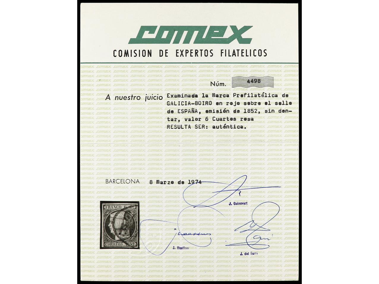ESPAÑA. 6 cuartos rosa, mat. prefilatélico ovalado GALICIA/BOIRO en rojo. RARÍSIMO y ÚNICO CONOCIDO en esta emisión. Ex. colección ALEMANY. Cert. COMEX. Ed.12.