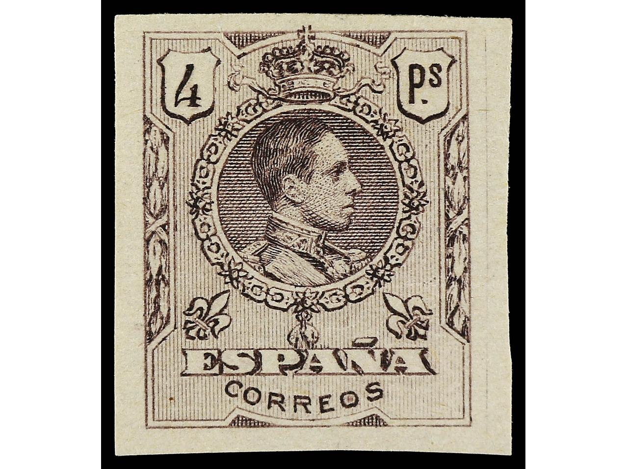 ESPAÑA. 4 pesetas violeta. Numeración particular, SIN DENTAR. Ed.279s. Cat. 285€. (Image1)