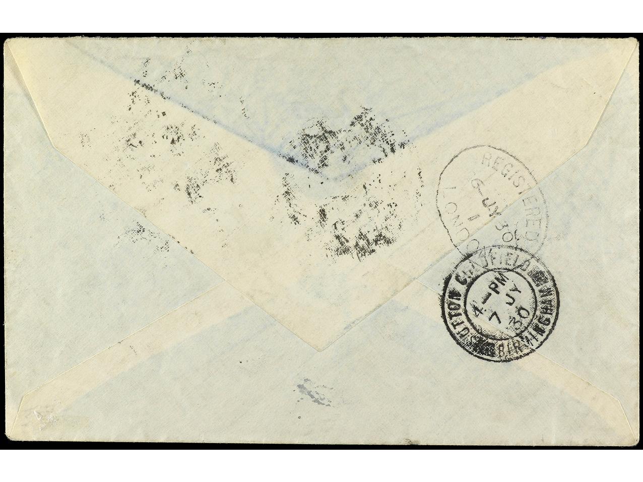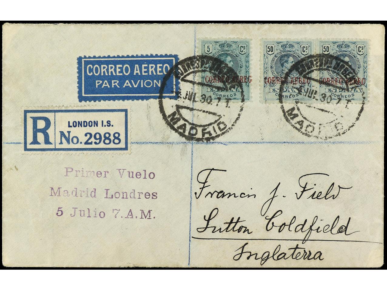 ESPAÑA. 1930 (5 julio). MADRID a LUTTON. 5 cts. verde, 50 cts. azul (2), marca PRIMER VUELO/MADRID LONDRES/5 JULIO 7 A.M. Vuelo directo sin escalas en Francia. MUY RARO. Ed.292, 295 (2). (Image1) (Image2)