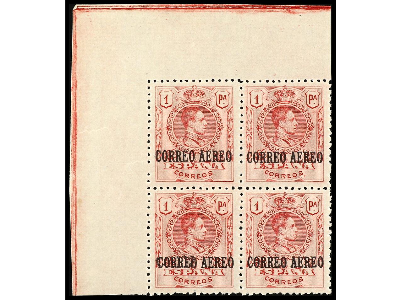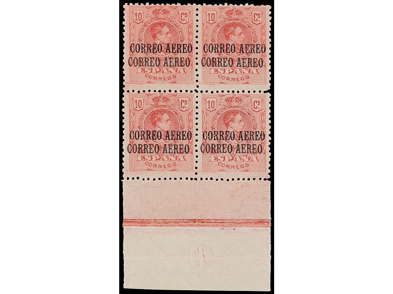 ESPAÑA. 10 céntimos rojo, bloque de 4, DOBLE HABILITACIÓN. Ed.293hh. Cat. 460€. (Image1)