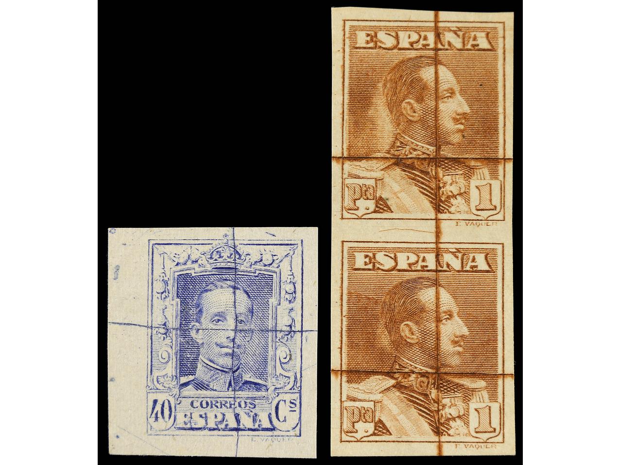 ESPAÑA. 40 cts. azul y 1 pta. castaño (pareja vertical). PLANCHAS INUTILIZADAS. Ed.319PR y 321PR. (Image1)