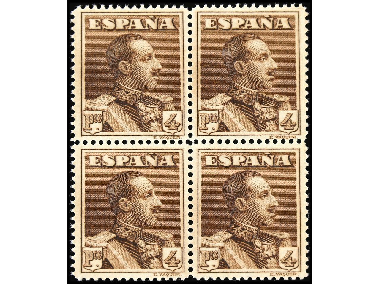 ESPAÑA. 4 pesetas castaño, bloque de cuatro. CAMBIO DE COLOR. Ed.322ec. Cat. 348€. (Image1)
