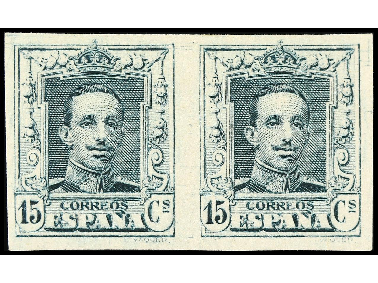 ESPAÑA. 15 cts. verde. Pareja SIN DENTAR. Al dorso numeración auténtica B 285,218. LUJO. Firmado ROIG. Ed.315s. Cat. 1.150€. (Image1)