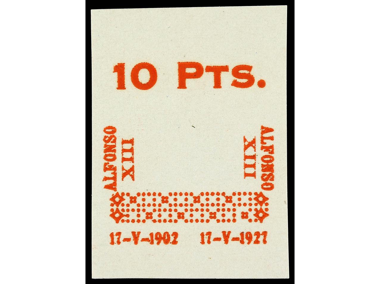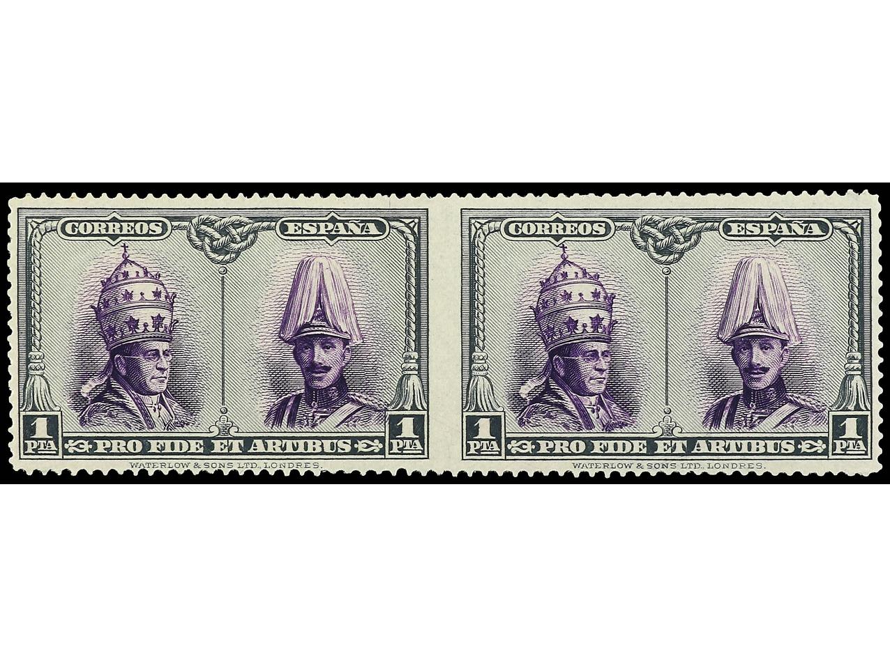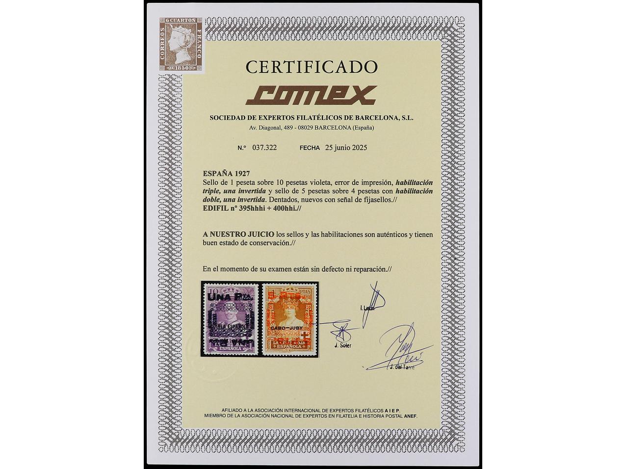 ESPAÑA. 1 pta. sobre 10 pts. violeta HABILITACIÓN TRIPLE, UNA INVERTIDA y 5 pts. sobre 4 pts. castaño. HABILITACIÓN DOBLE, UNA INVERTIDA. MUY RAROS. Cert. COMEX. Ed.395 y 400hhi. Cat. 1.000€. (Image1) (Image2)